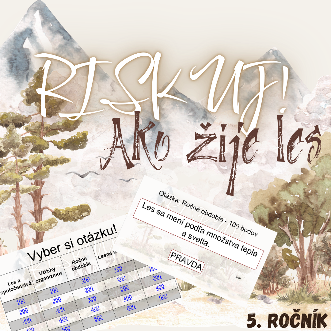 RISKUJ! – Ako žije les je interaktívna a hravá vzdelávacia aktivita určená pre žiakov 5. ročníka základnej školy. Slúži na upevnenie, zopakovanie a rozšírenie poznatkov o lese, jeho obyvateľoch a ekosystéme zážitkovou formou, ktorá žiakov motivuje a zároveň zabaví.