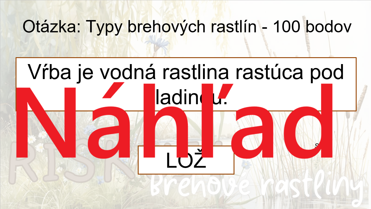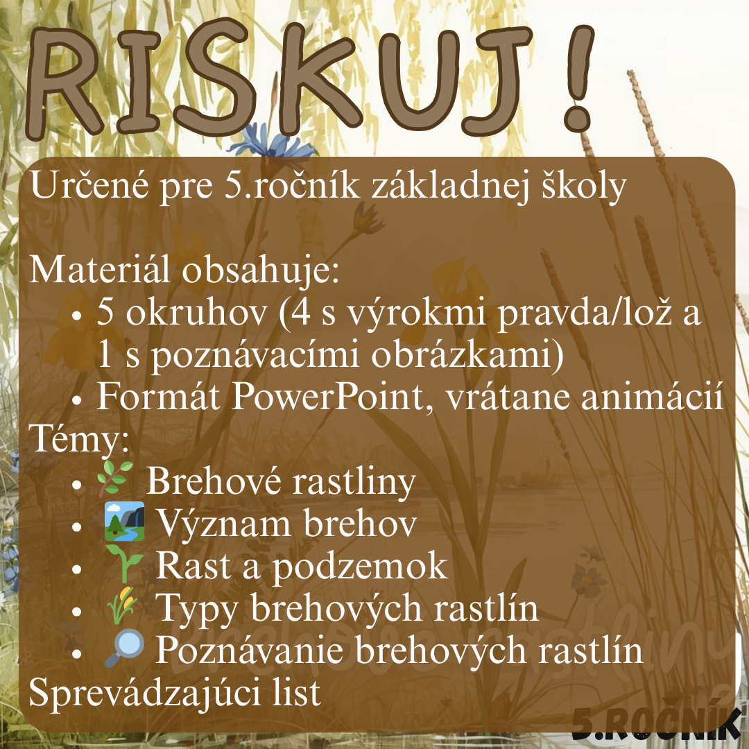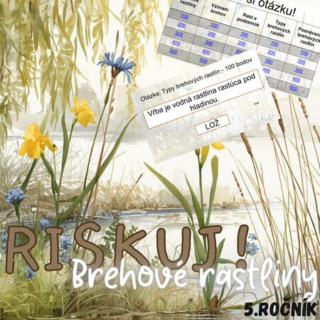 Materiál „RISKUJ! – Brehové rastliny“ je interaktívna a súťažná edukačná hra určená pre žiakov 5. ročníka základnej školy na hodiny biológie. Aktivita je tematicky zameraná na rastliny rastúce v okolí vodných plôch a hravou formou pomáha zopakovať, upevniť a prehĺbiť poznatky o ich stavbe, raste a význame.