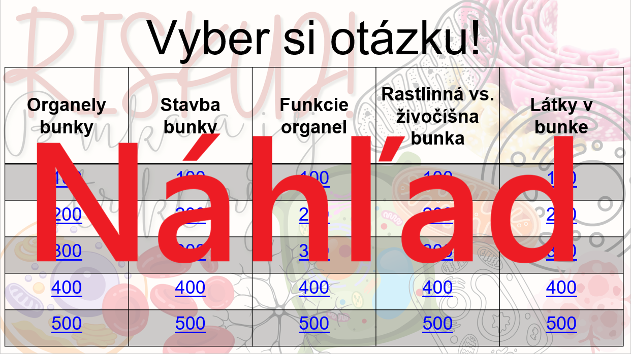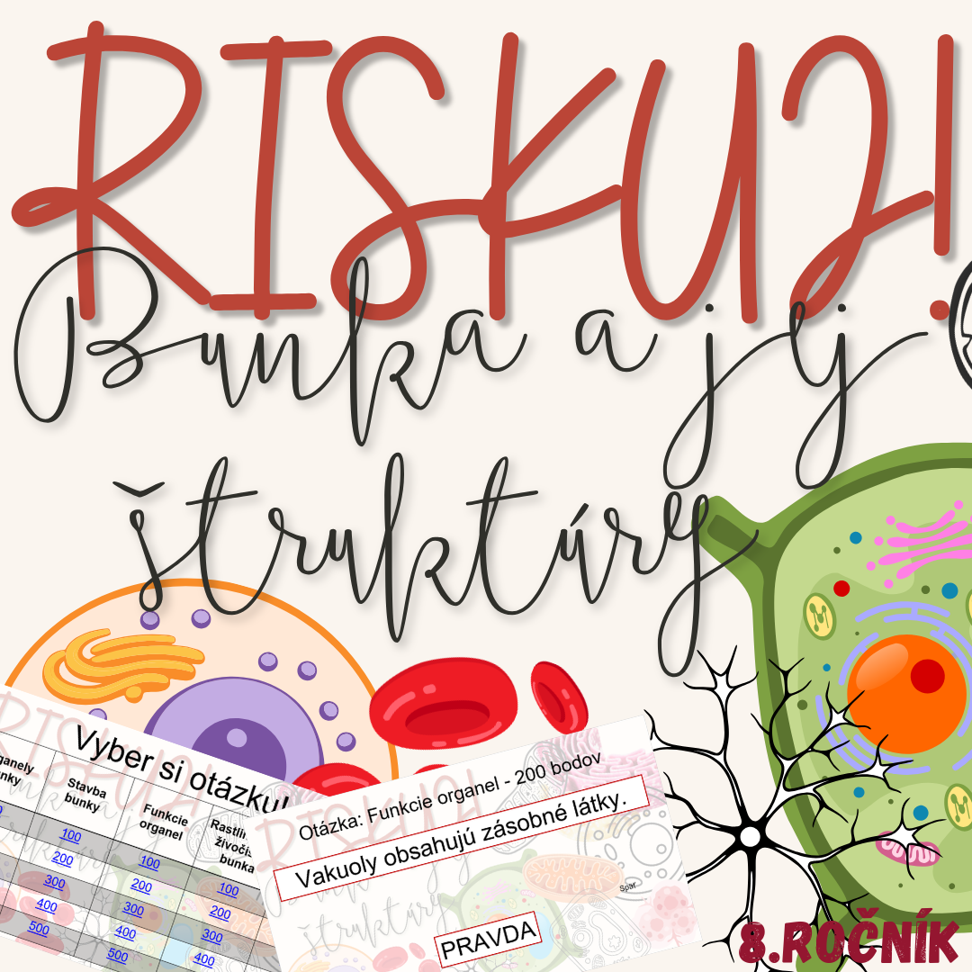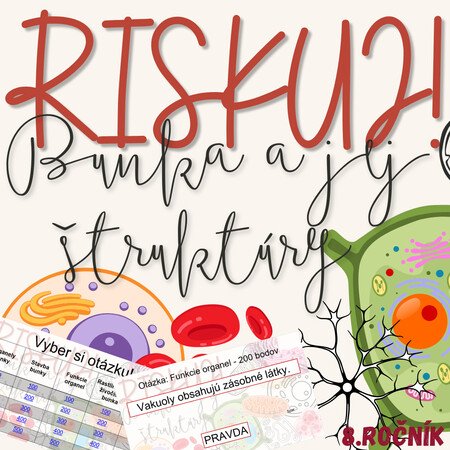 Materiál „RISKUJ! – Bunka a jej štruktúry“ je interaktívna a súťažná edukačná hra určená pre žiakov 8. ročníka základnej školy. Zameriava sa na stavbu bunky, jej organely a ich funkčný význam.