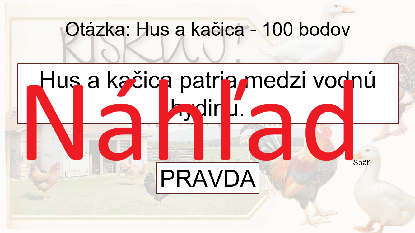 Hra je inšpirovaná súťažou Riskuj! – žiaci si vyberajú otázky z piatich okruhov (100 – 500 bodov) a odpovedajú na výroky typu pravda/lož.