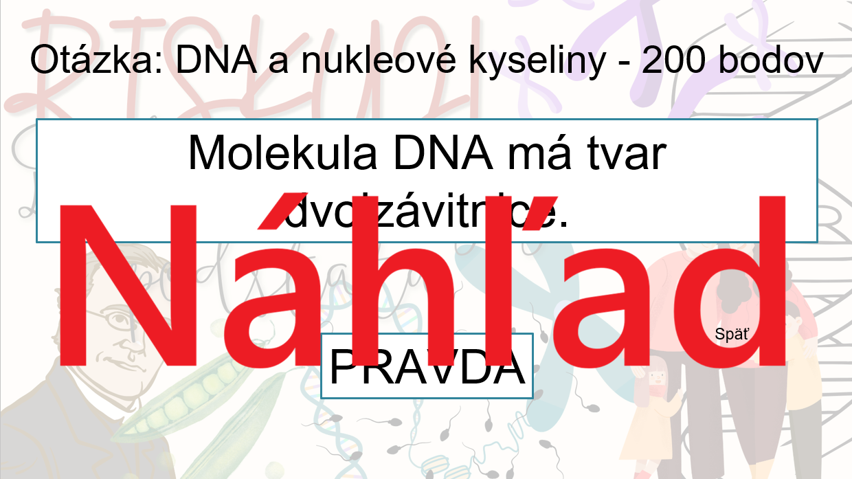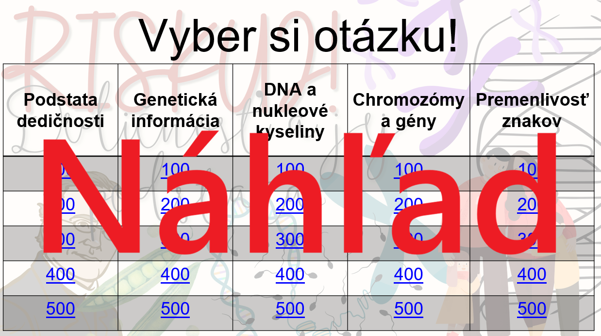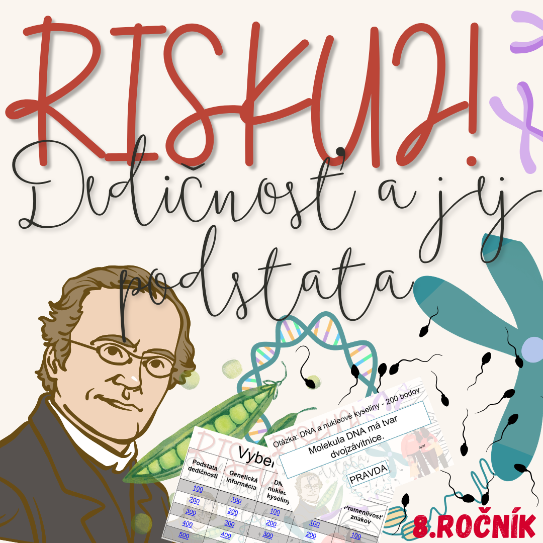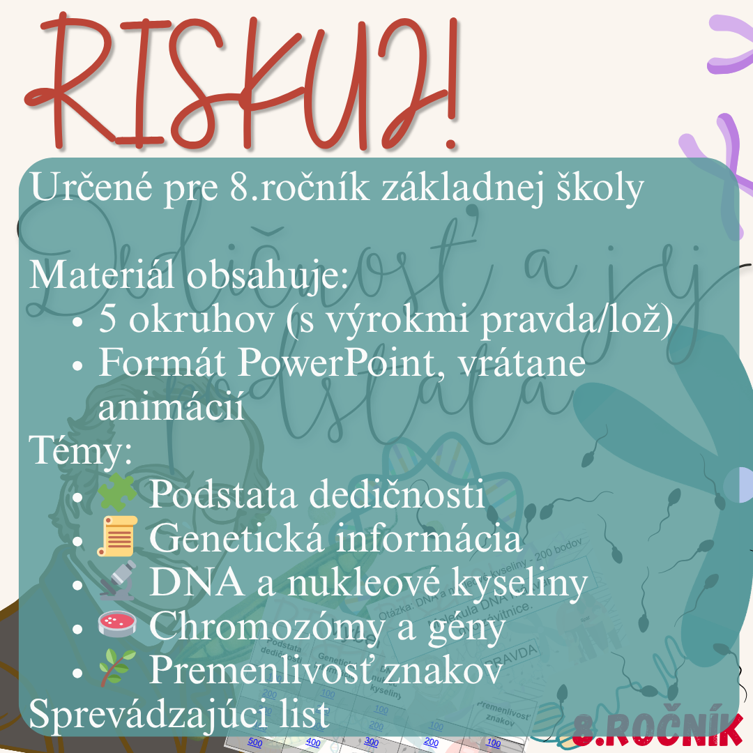 Materiál „RISKUJ! – Dedičnosť a jej podstata“ je interaktívna a súťažná edukačná hra určená pre žiakov 8. ročníka základnej školy. Zameriava sa na základné princípy dedičnosti a genetickej informácie.