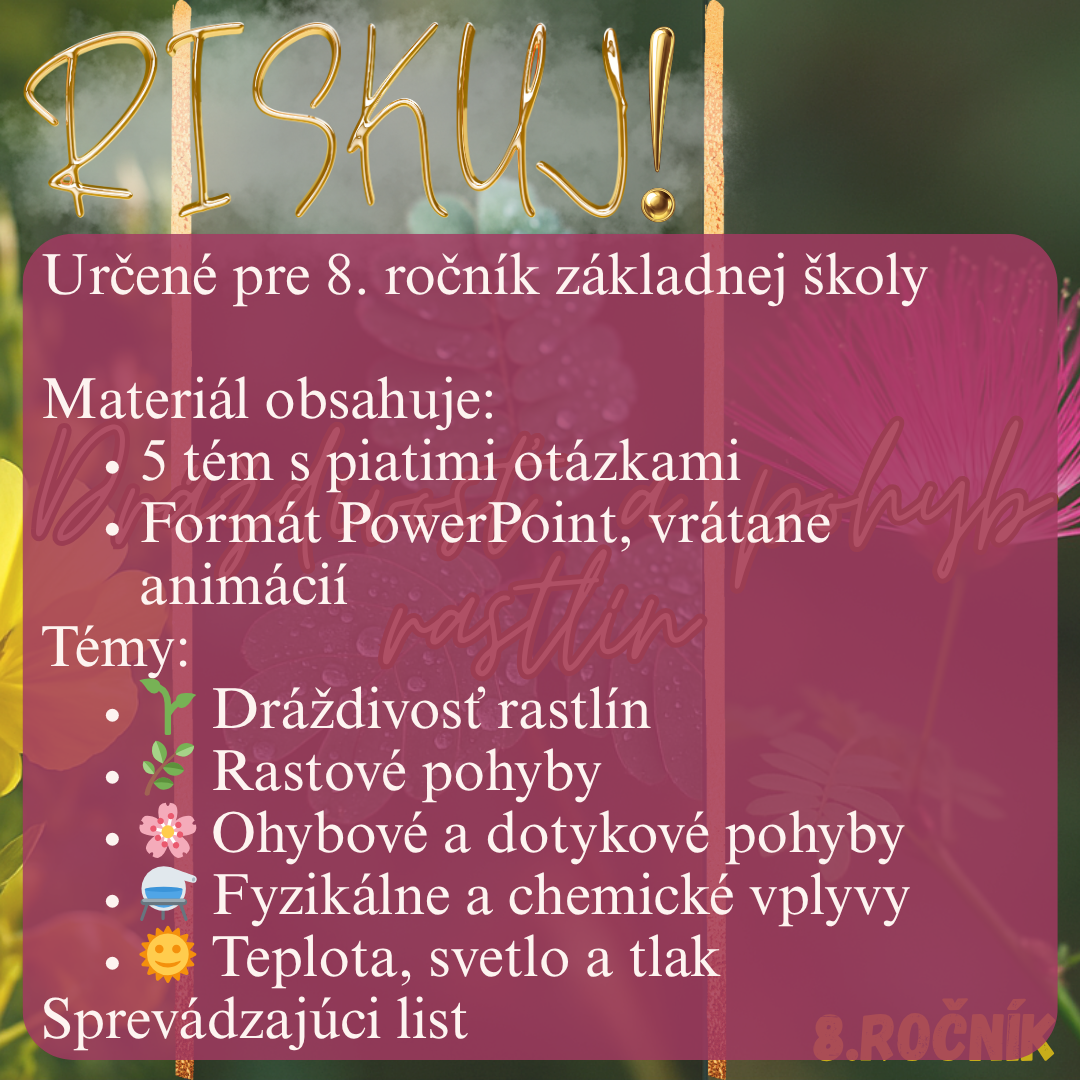 Materiál RISKUJ! – Dráždivosť a pohyb rastlín je interaktívna a zábavná aktivita určená pre žiakov 8. ročníka základnej školy.