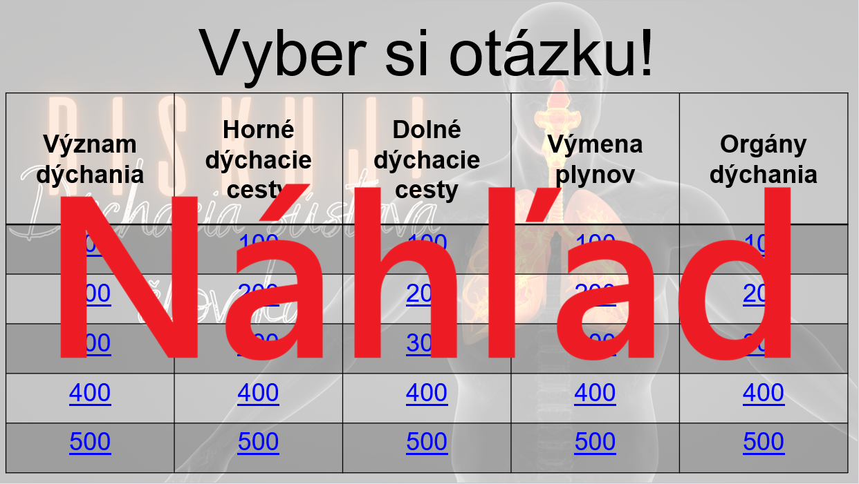 Materiál „RISKUJ! – Dýchacia sústava človeka“ je interaktívna a súťažná edukačná hra určená pre žiakov 7. ročníka základnej školy na hodiny biológie. Aktivita je tematicky zameraná na stavbu a funkciu dýchacej sústavy a hravou formou pomáha zopakovať, upevniť a prehĺbiť poznatky o procese dýchania.