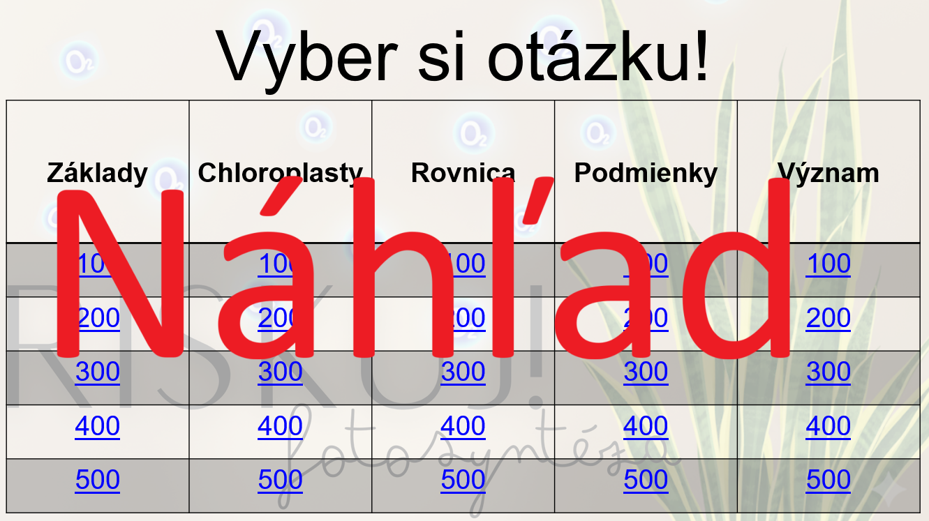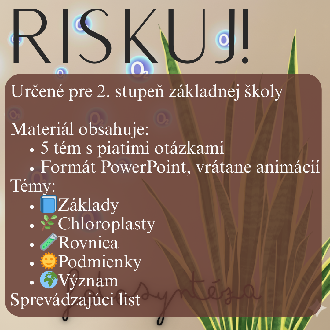 RISKUJ! – Fotosyntéza je interaktívna a hravá vzdelávacia aktivita navrhnutá pre žiakov 2. stupňa základnej školy. Predstavuje ideálny spôsob, ako si žiaci môžu zážitkovou a súťaživou formou upevniť a rozšíriť poznatky o fotosyntéze – jej priebehu, podmienkach a význame pre život na Zemi – bez zdĺhavého vypytovania či pasívneho memorovania.