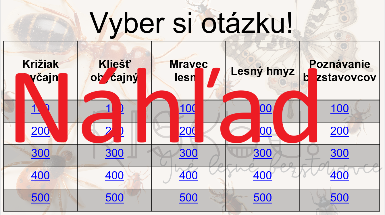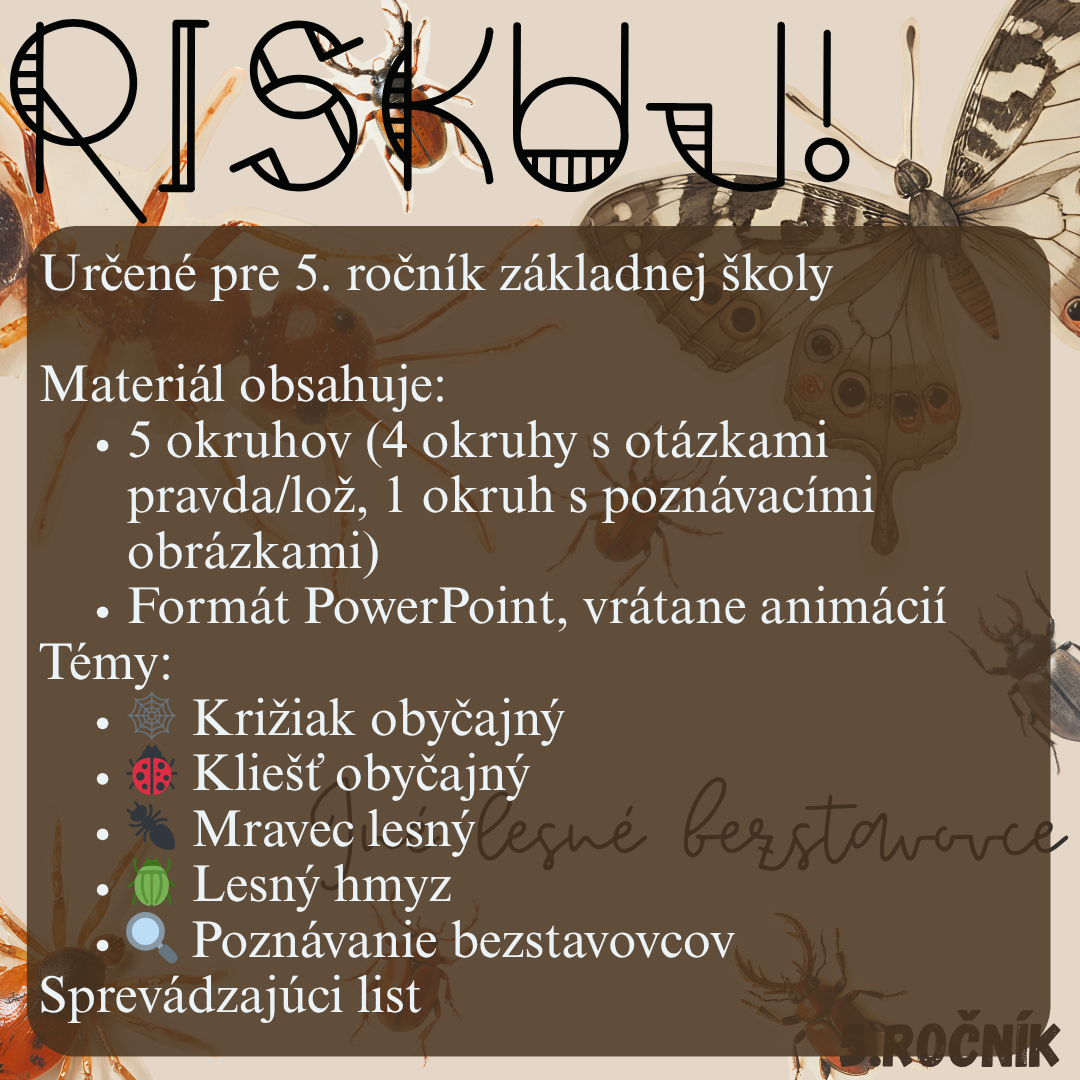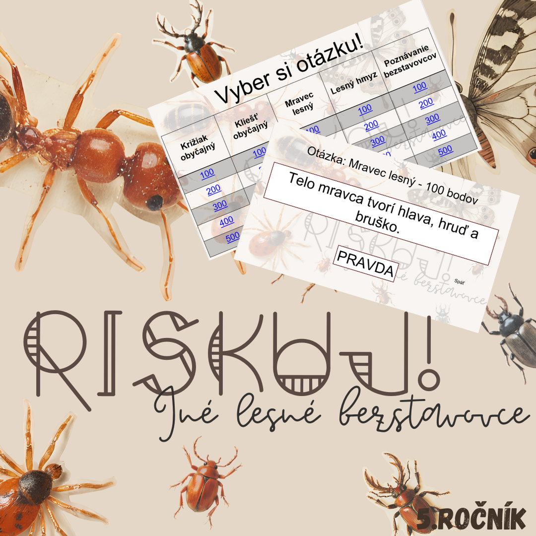 Materiál RISKUJ! – Iné lesné bezstavovce je interaktívna a zážitková hra, ktorá žiakom pomáha hravo si zopakovať a upevniť poznatky o drobných živočíchoch lesa.