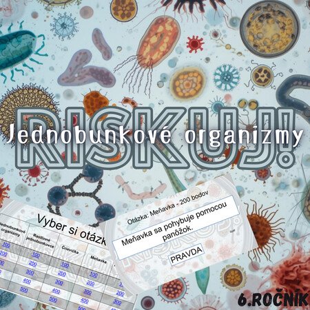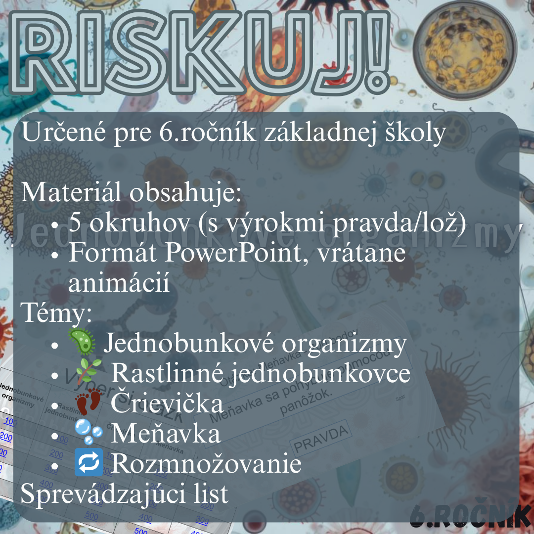 Materiál „RISKUJ! – Jednobunkové organizmy“ je interaktívna a súťažná edukačná hra určená pre žiakov 6. ročníka základnej školy. Hravou formou pomáha zopakovať, upevniť a prehĺbiť poznatky o jednobunkových organizmoch, ich stavbe, spôsoboch života a rozmnožovaní.