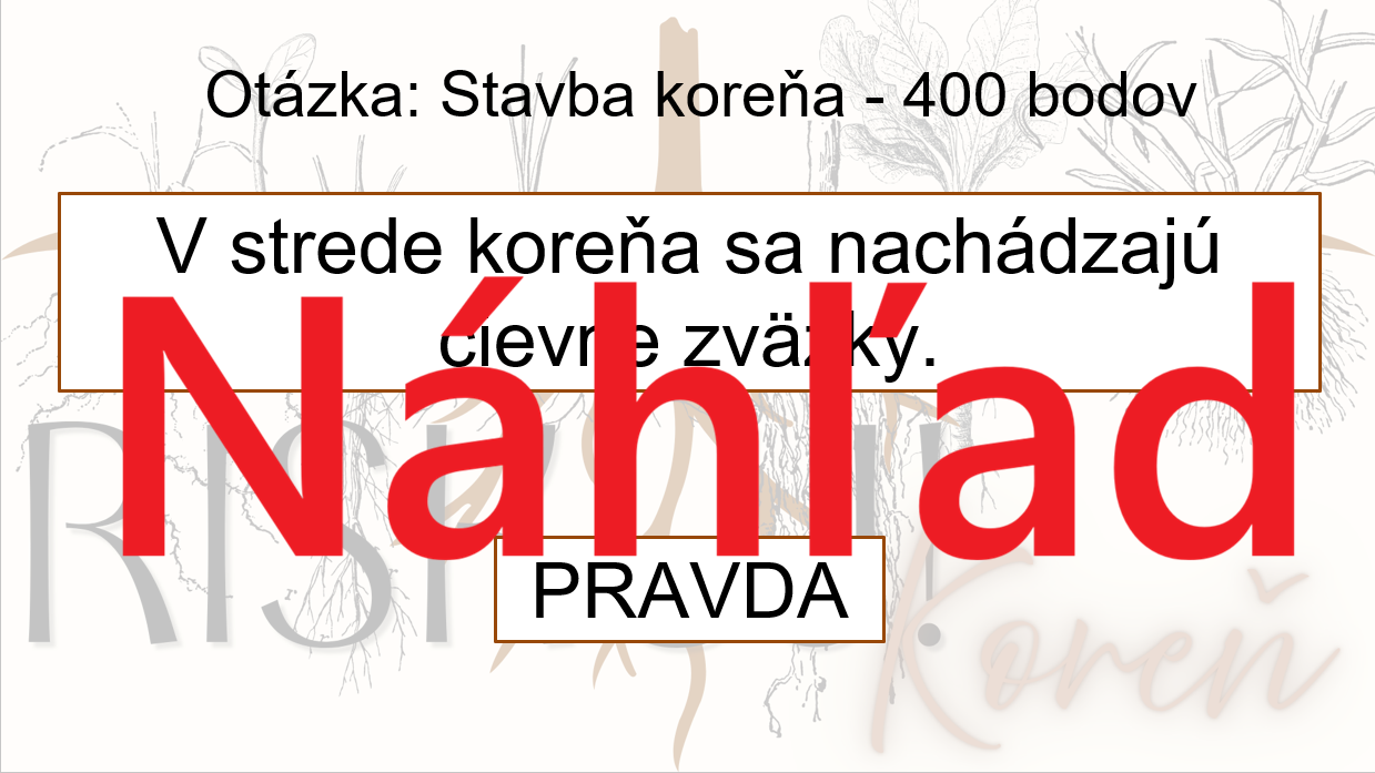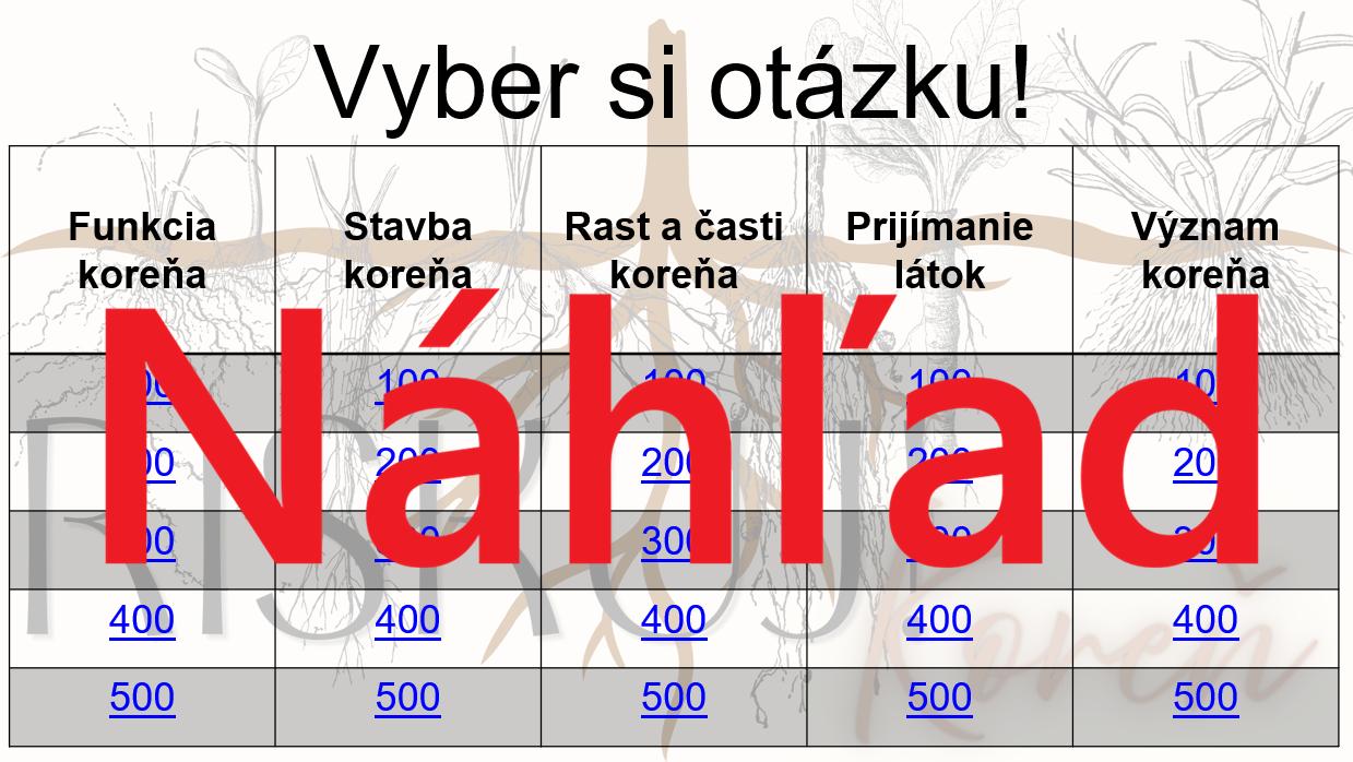 Materiál „RISKUJ! – Koreň“ je interaktívna a súťažná edukačná hra určená pre žiakov 6. ročníka základnej školy na hodiny biológie. Tematicky je zameraná na stavbu, funkciu, rast a význam koreňa ako základnej časti rastlinného tela.