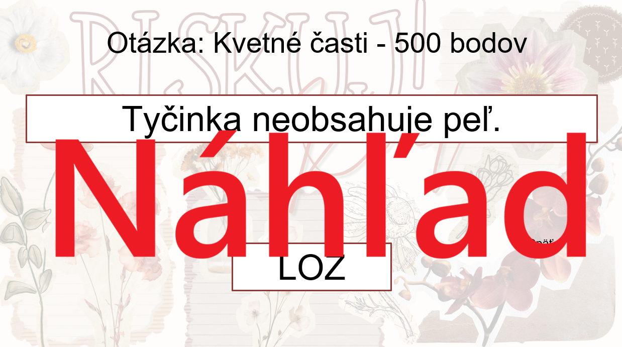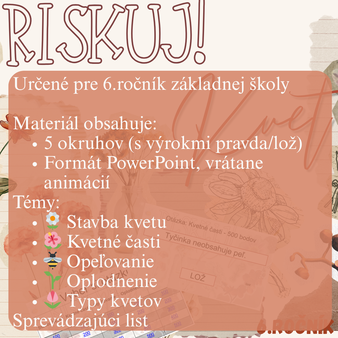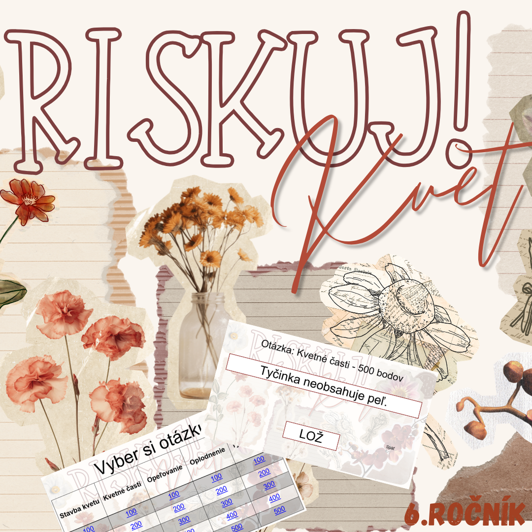 Materiál „RISKUJ! – Kvet“ je interaktívna a súťažná edukačná hra určená pre žiakov 6. ročníka základnej školy na hodiny biológie. Zameriava sa na stavbu kvetu, jeho časti a procesy súvisiace s rozmnožovaním rastlín.