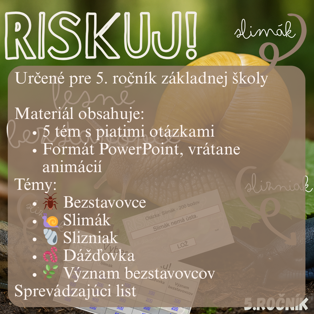 Materiál RISKUJ! – Lesné bezstavovce je interaktívna a zábavná aktivita, ktorá pomáha žiakom 5. ročníka zopakovať a upevniť poznatky o bezstavovcoch žijúcich v lese, ako sú slimáky, slizniaky a dážďovky.