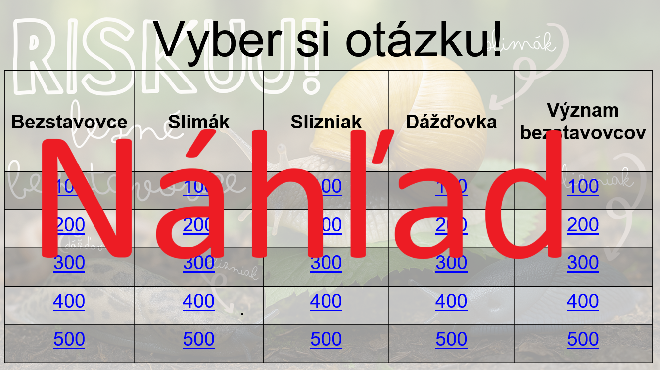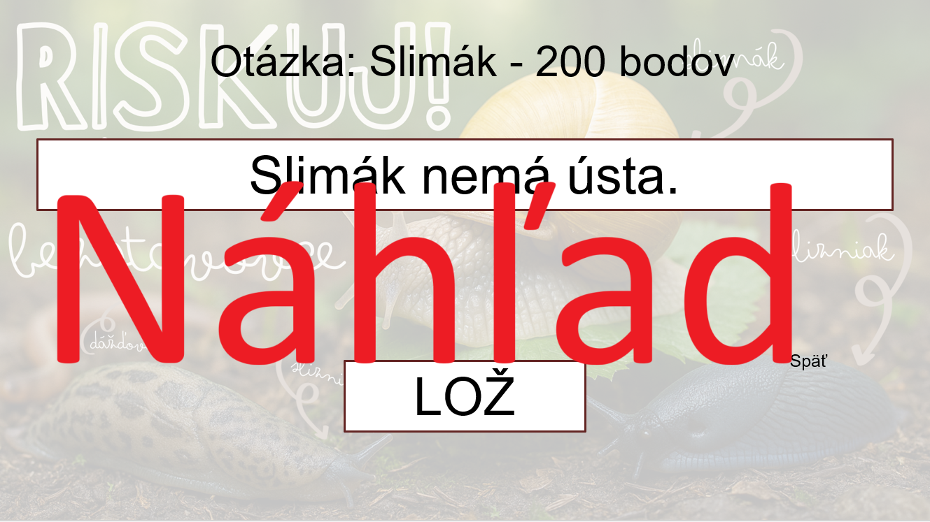 Hra je inšpirovaná televíznou súťažou Riskuj! – žiaci si vyberajú otázky z piatich tematických okruhov podľa obtiažnosti (100 – 500 bodov) a odpovedajú na výroky typu pravda/lož.