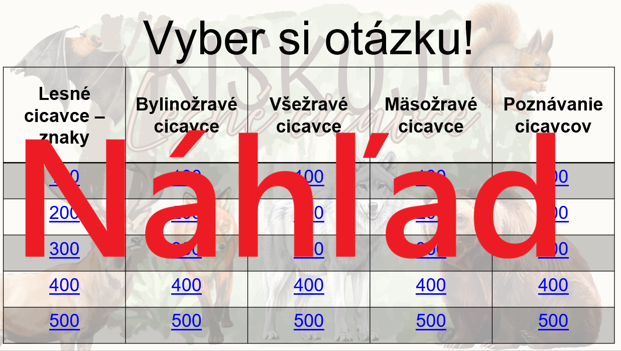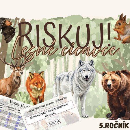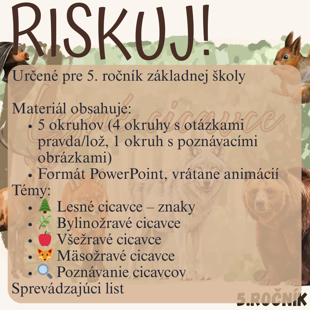 Materiál „RISKUJ! – Lesné cicavce“ je interaktívna a súťažná edukačná hra určená pre žiakov 5. ročníka základnej školy. Hravou formou pomáha zopakovať, upevniť a rozšíriť poznatky o cicavcoch žijúcich v lesnom prostredí, ich typických znakoch, spôsobe života a význame pre lesný ekosystém.