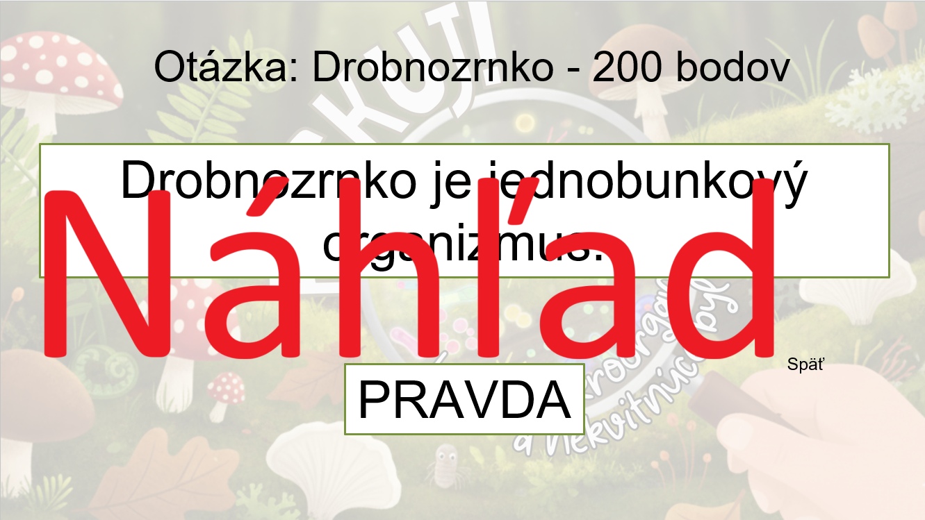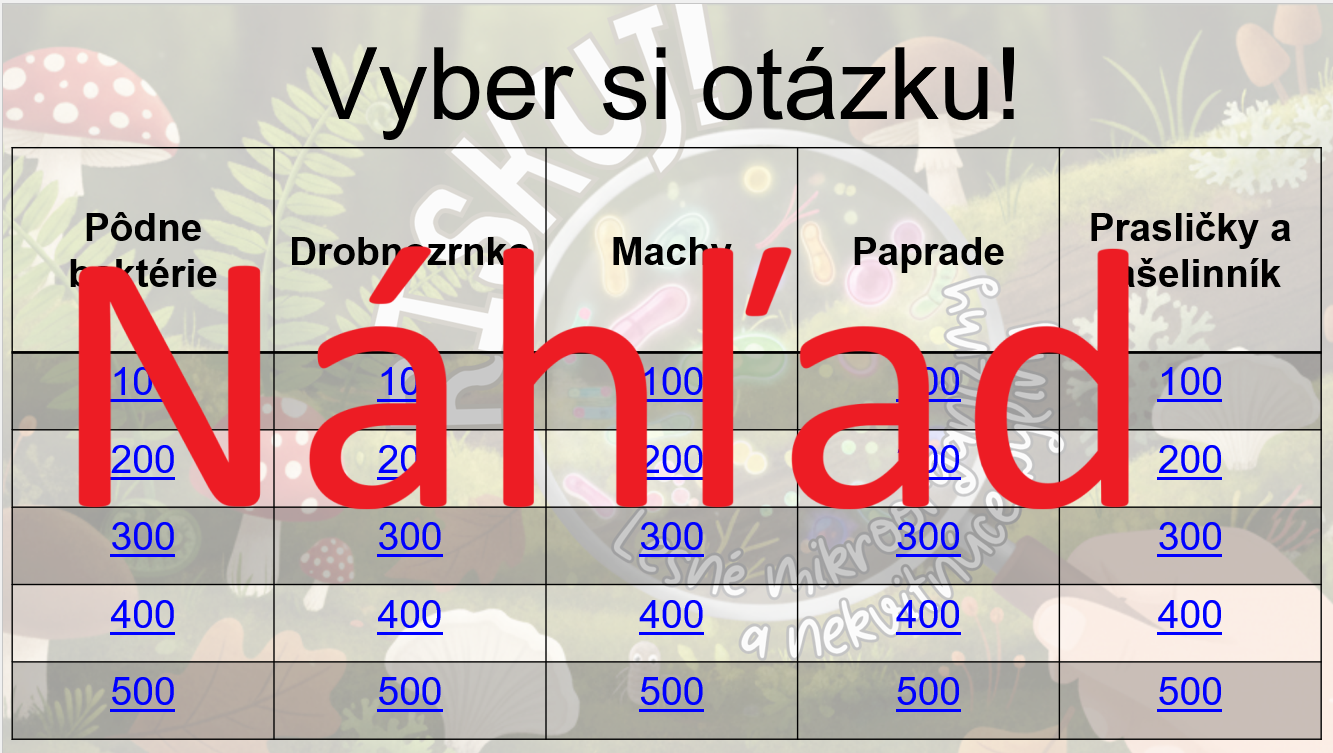 Materiál RISKUJ! – Lesné mikroorganizmy a nekvitnúce byliny je interaktívna a hravá aktivita určená pre žiakov 5. ročníka základnej školy na hodiny biológie. Slúži na opakovanie, upevnenie a rozšírenie vedomostí o pôdnych mikroorganizmoch a nekvitnúcich rastlinách, ktoré sú dôležitou súčasťou lesného ekosystému.