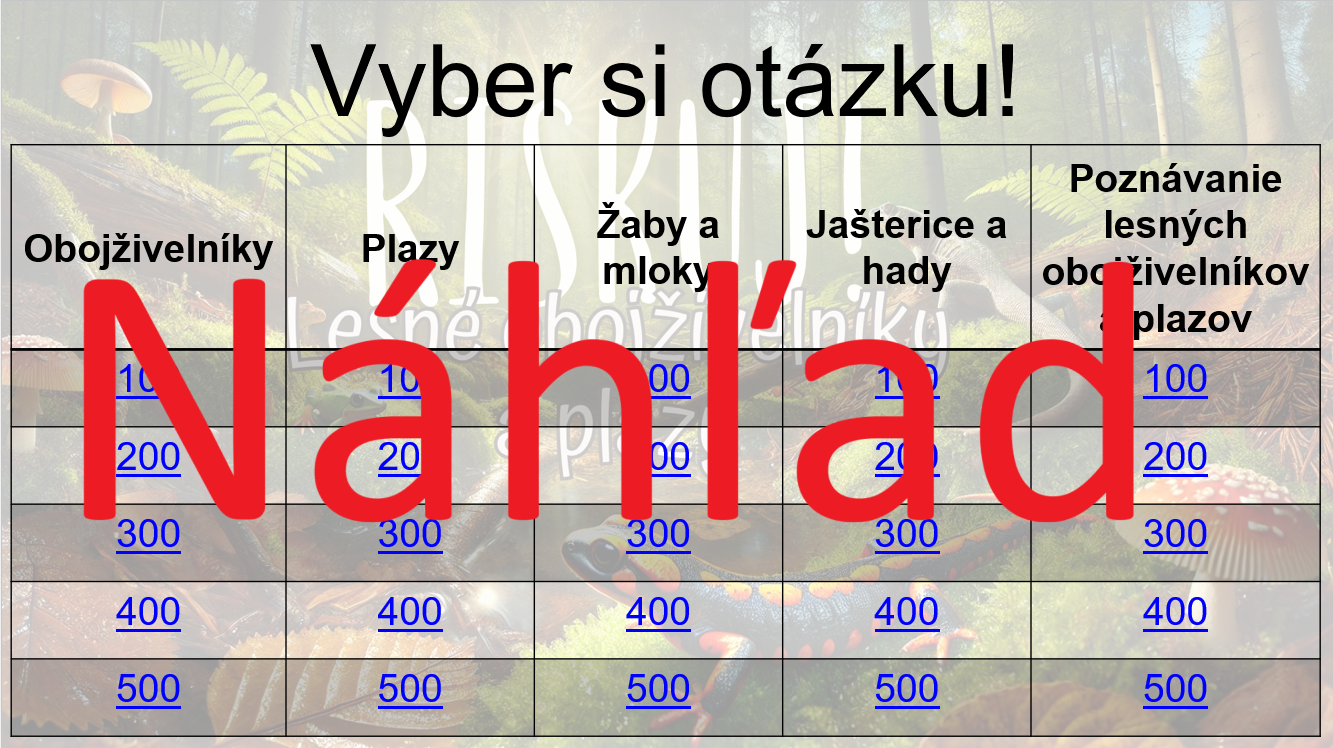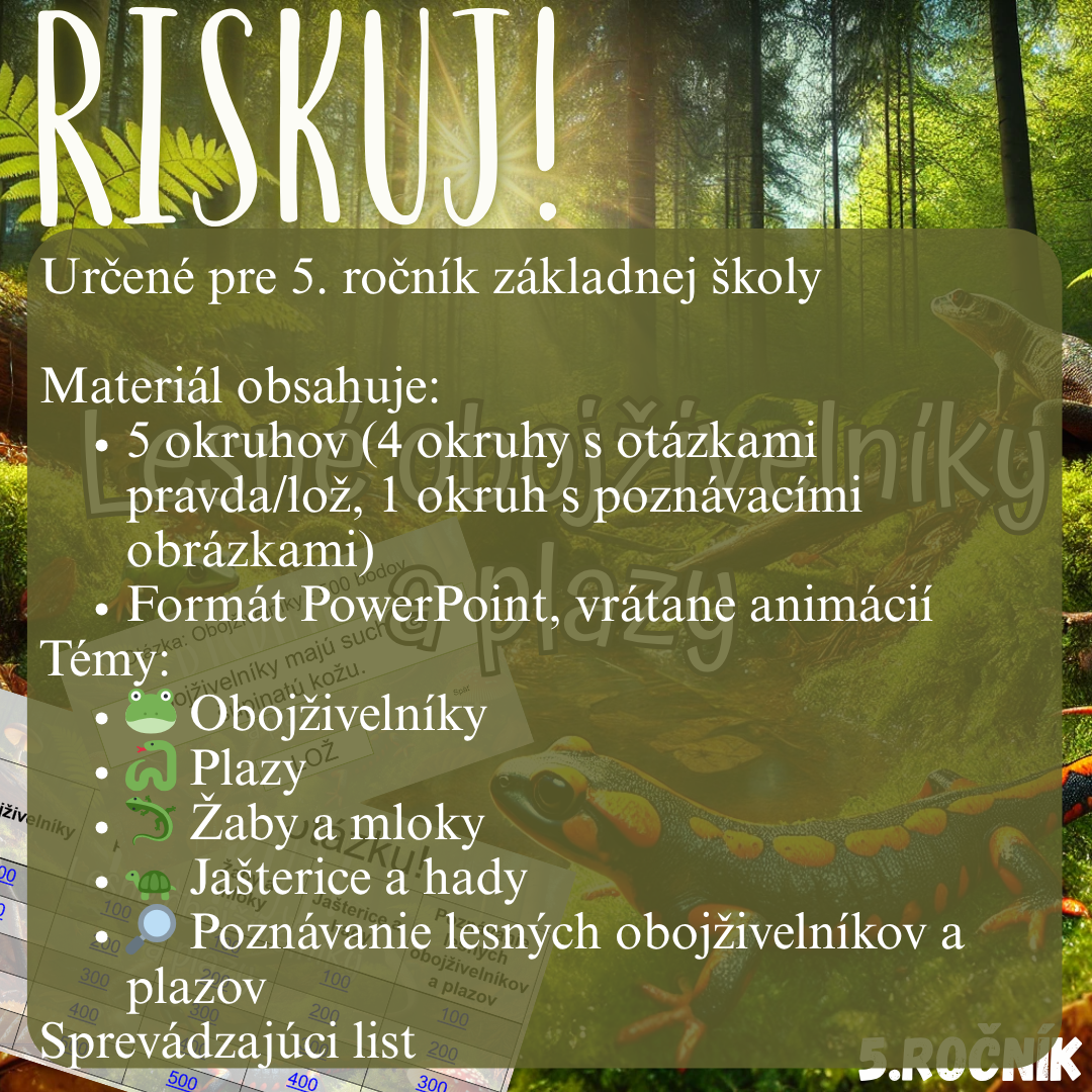 Materiál RISKUJ! – Lesné obojživelníky a plazy je interaktívna a hravá vzdelávacia aktivita, ktorá pomáha žiakom zábavnou formou zopakovať a upevniť poznatky o obojživelníkoch a plazoch žijúcich v lese.