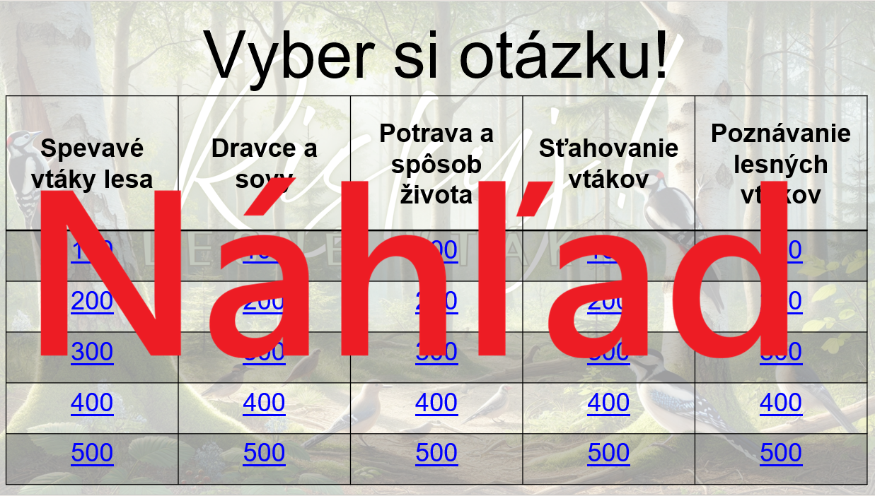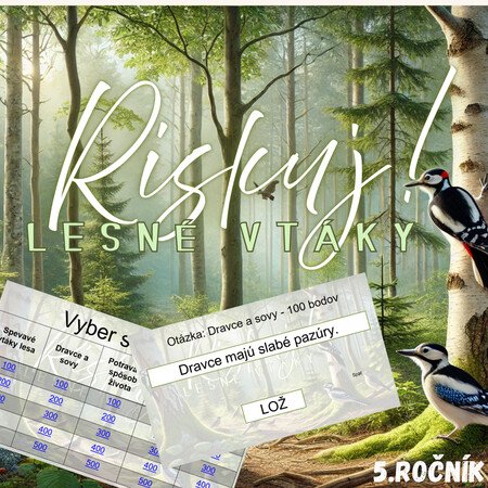 Materiál „RISKUJ! – Lesné vtáky“ je interaktívna a súťažná edukačná hra určená pre žiakov 5. ročníka základnej školy. Hravou formou pomáha zopakovať a upevniť poznatky o vtákoch žijúcich v lesnom prostredí, ich typických znakoch, spôsobe života a význame pre lesný ekosystém.