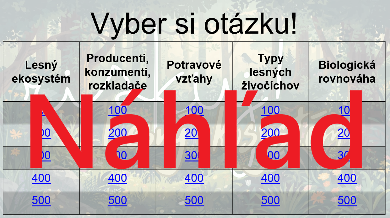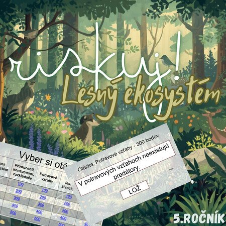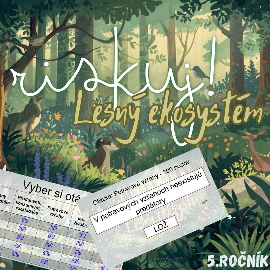 Materiál „RISKUJ! – Lesný ekosystém“ je interaktívna a súťažná edukačná hra určená pre žiakov 5. ročníka základnej školy. Hravou formou pomáha zopakovať, upevniť a prehĺbiť poznatky o lese ako prírodnom ekosystéme, jeho zložkách a vzájomných vzťahoch medzi organizmami.