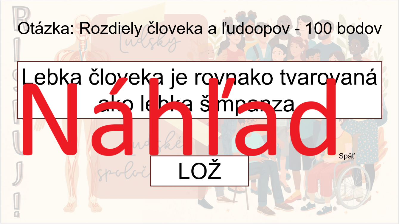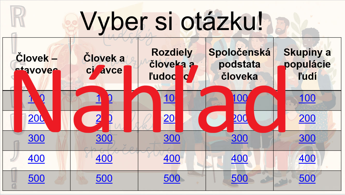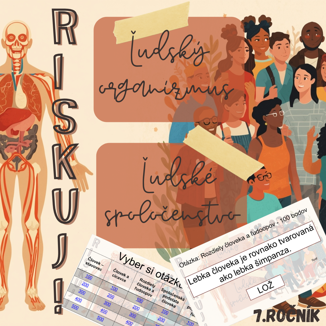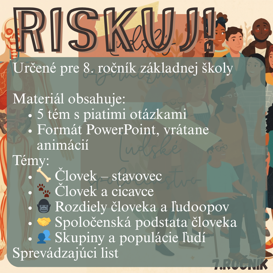 Materiál RISKUJ! – Ľudský organizmus a ľudské spoločenstvo je interaktívna didaktická hra pripravená pre žiakov 7. ročníka základnej školy. Slúži na zopakovanie a upevnenie poznatkov o biologických aj spoločenských aspektoch človeka. Žiaci si zábavnou formou precvičia chápanie človeka ako stavovca, porovnanie s cicavcami a ľudoopmi, ale aj základy sociálnej biológie a fungovania ľudských skupín.
