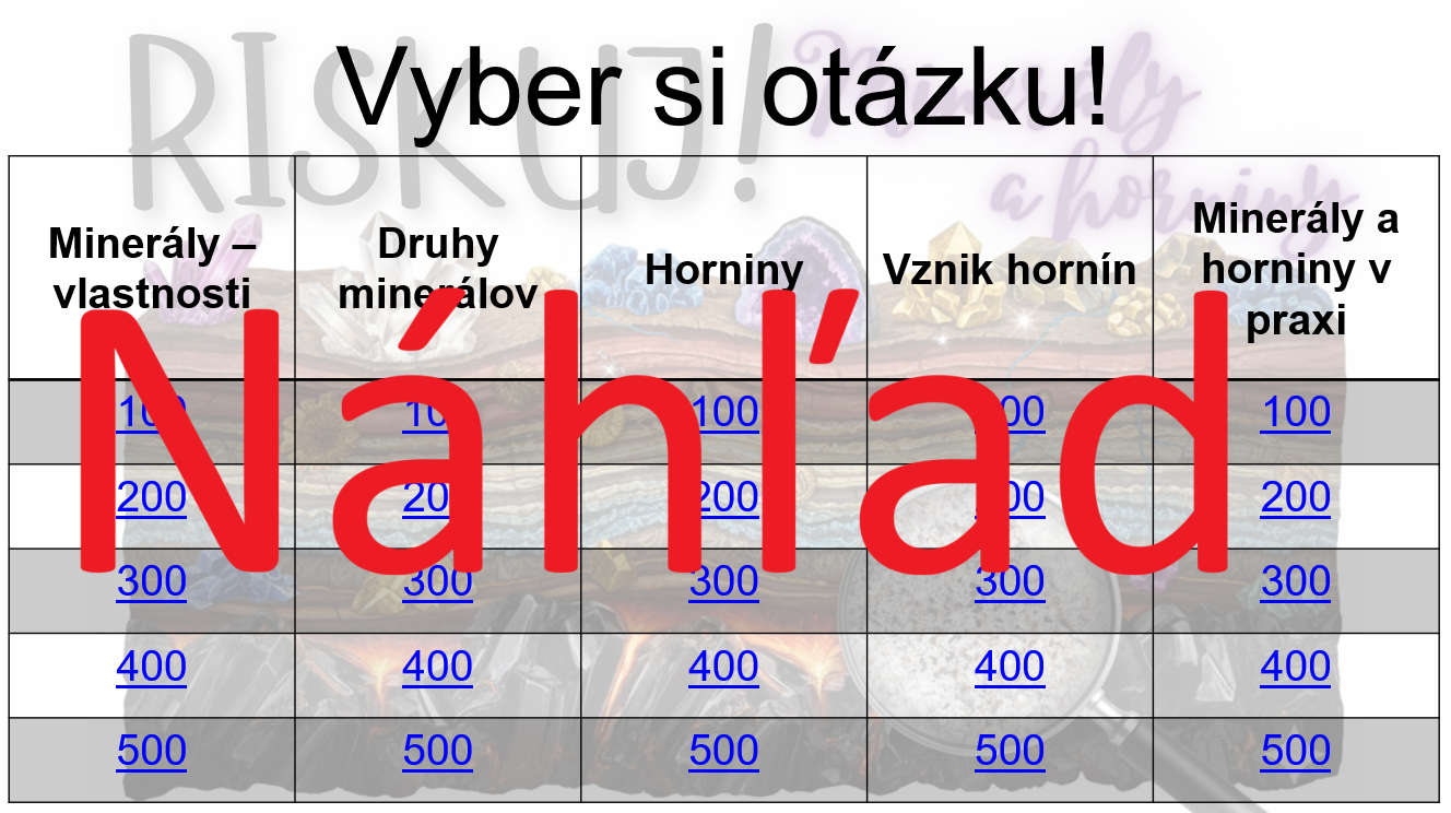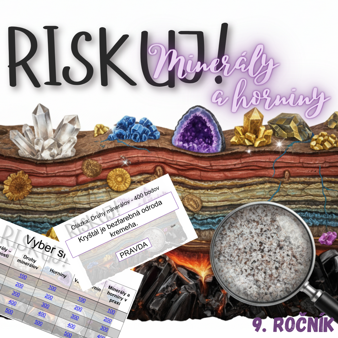 Materiál RISKUJ! – Minerály a horniny je interaktívna a hravá aktivita určená pre žiakov 9. ročníka základnej školy, ktorá slúži na opakovanie a upevnenie poznatkov o mineráloch, horninách a ich význame.