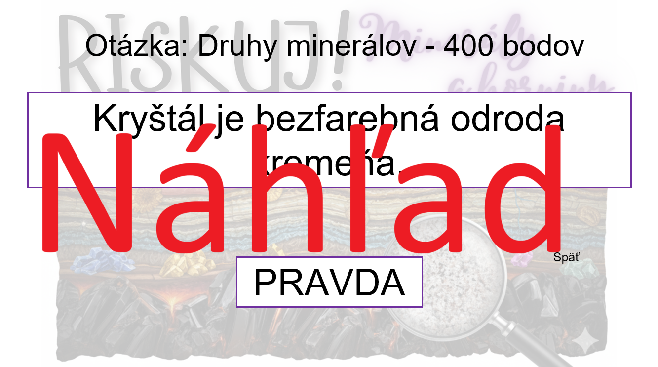 Hra je inšpirovaná televíznou súťažou Riskuj! – žiaci si vyberajú otázky z piatich tematických okruhov podľa obtiažnosti (100 – 500 bodov) a odpovedajú na výroky typu pravda / lož. Aktivita rozvíja logické myslenie, rýchle rozhodovanie, tímovú spoluprácu a prácu s odbornými pojmami, pričom spríjemňuje hodiny biológie alebo geovedy zážitkovou formou.