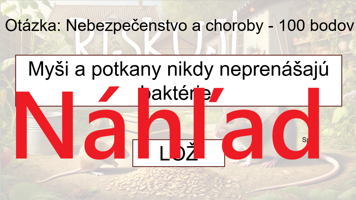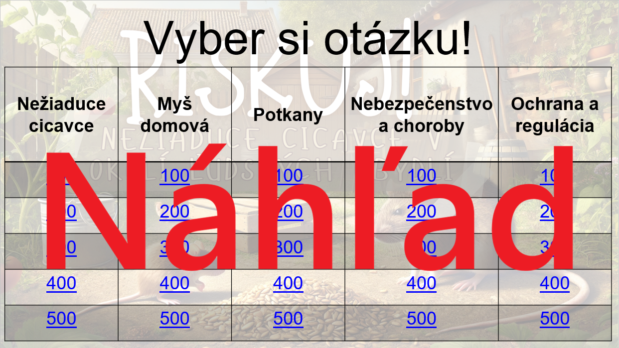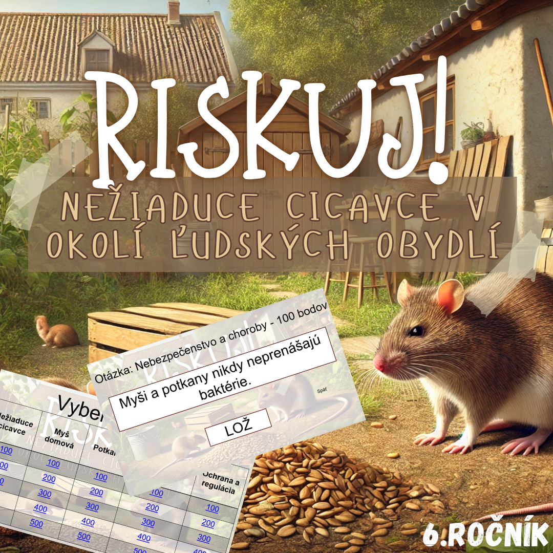 Materiál „RISKUJ! – Nežiaduce cicavce v okolí ľudských obydlí“ je interaktívna a súťažná edukačná hra určená pre žiakov 6. ročníka základnej školy. Hravou formou pomáha zopakovať a upevniť poznatky o cicavcoch, ktoré sa často vyskytujú v blízkosti človeka, o ich typických znakoch, spôsobe života a rizikách spojených s ich výskytom.