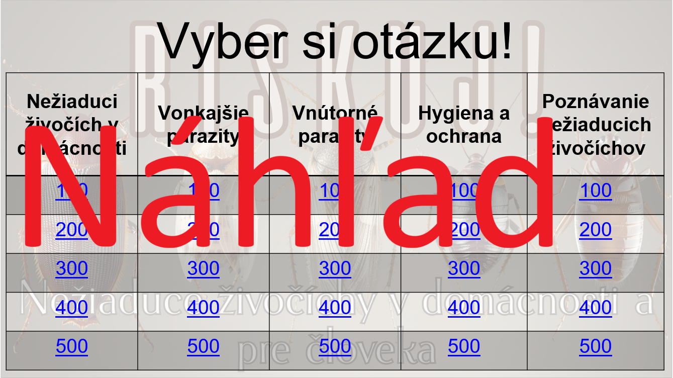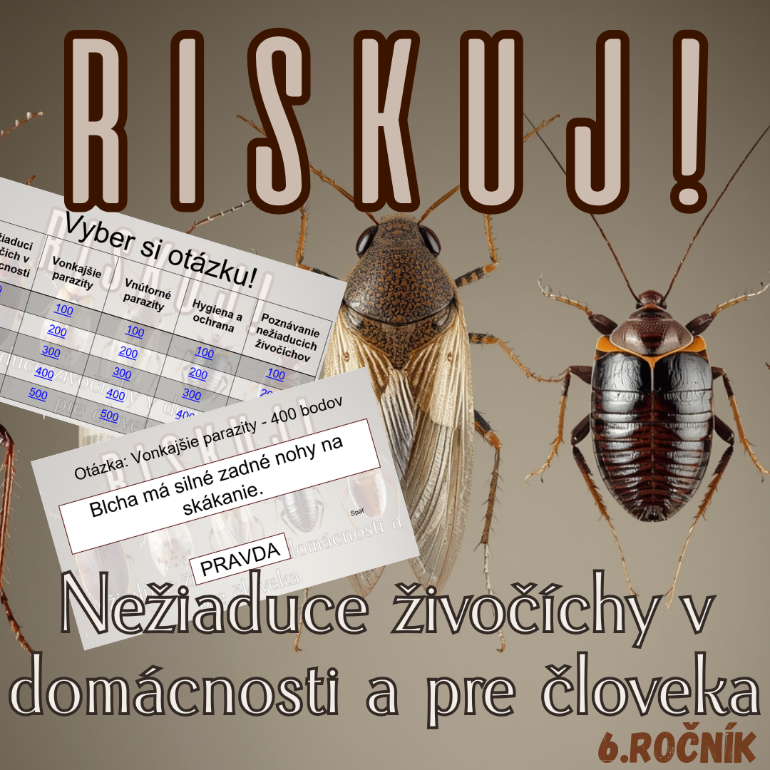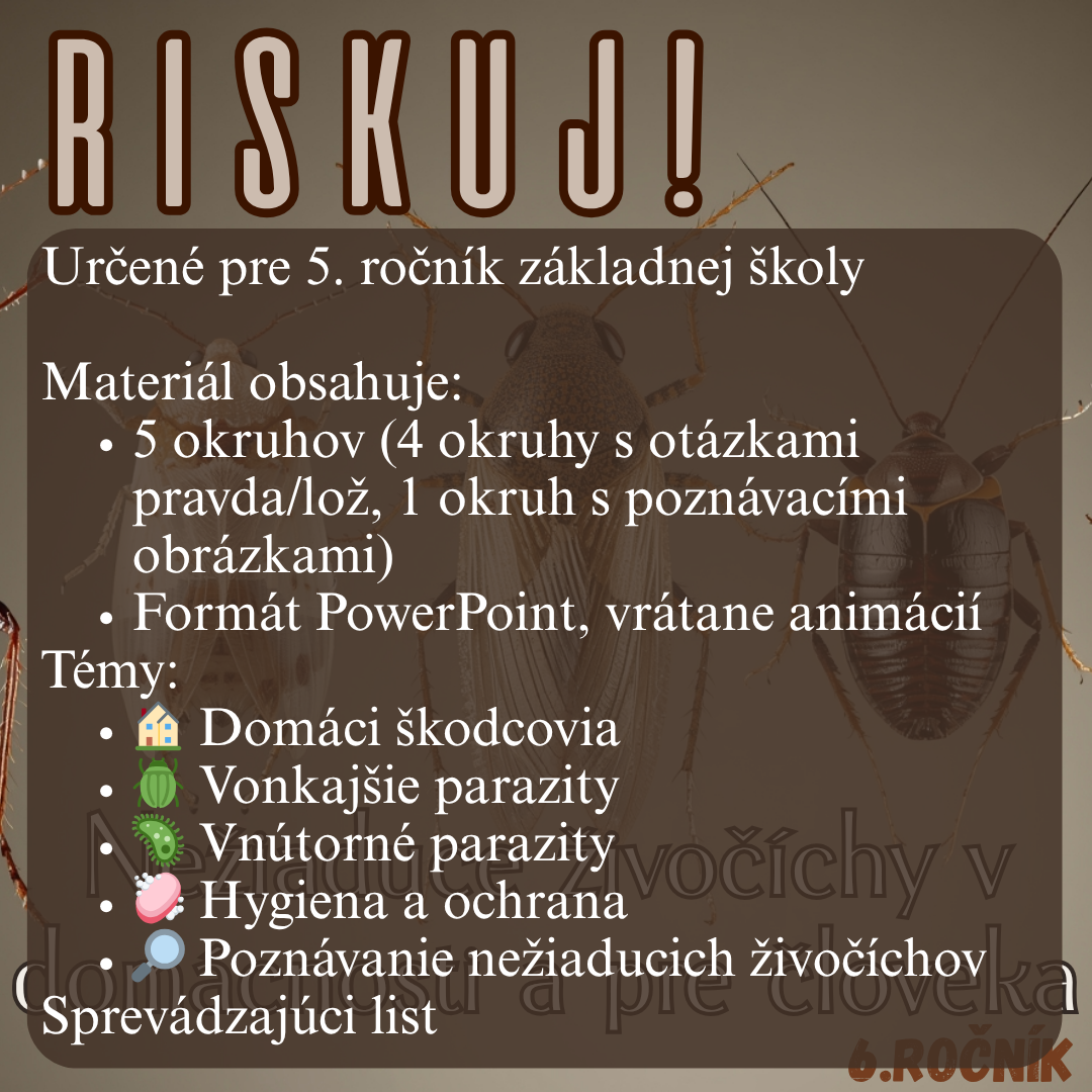 Materiál RISKUJ! – Nežiaduce živočíchy v domácnosti a pre človeka je interaktívna a súťažná aktivita, ktorá pomáha žiakom zábavnou formou zopakovať a upevniť učivo o živočíchoch, ktorí môžu byť človeku na škodu.