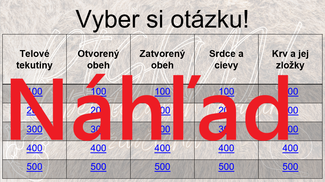 Materiál „RISKUJ! – Obeh telových tekutín živočíchov“ je interaktívna a súťažná edukačná hra určená pre žiakov 8. ročníka základnej školy. Hravou formou pomáha zopakovať, upevniť a prehĺbiť poznatky o obehu telových tekutín ako jednom zo základných životných procesov živočíchov, ktorý zabezpečuje prenos kyslíka, živín, hormónov a odpadových látok v tele.