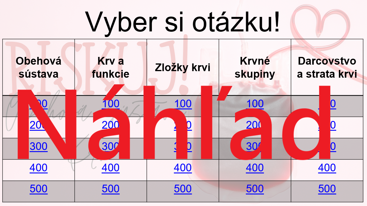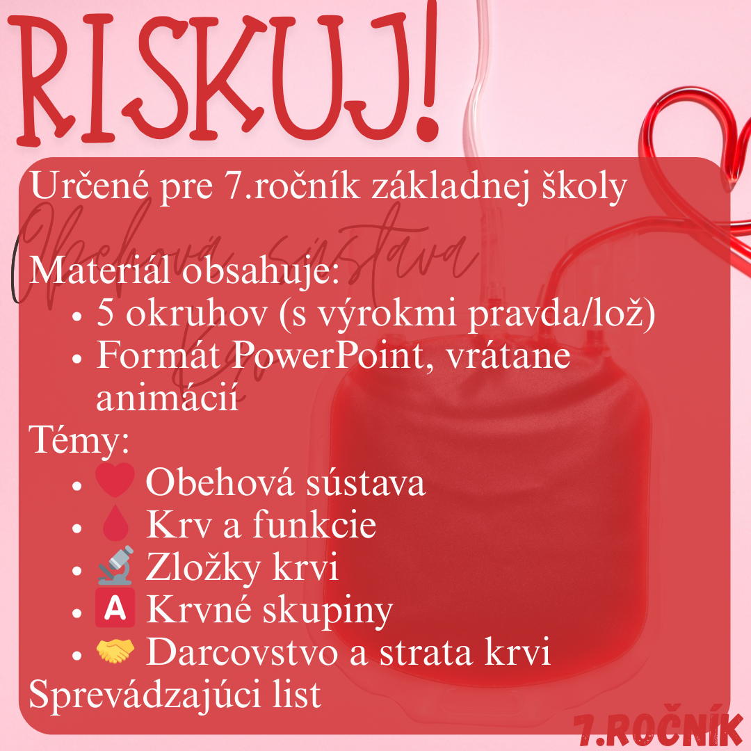 Materiál „RISKUJ! – Obehová sústava. Krv“ je interaktívna a súťažná edukačná hra určená pre žiakov 7. ročníka základnej školy na hodiny biológie. Aktivita je tematicky zameraná na obehovú sústavu a krv a hravou formou pomáha zopakovať, upevniť a prehĺbiť poznatky o ich stavbe a funkcii.
