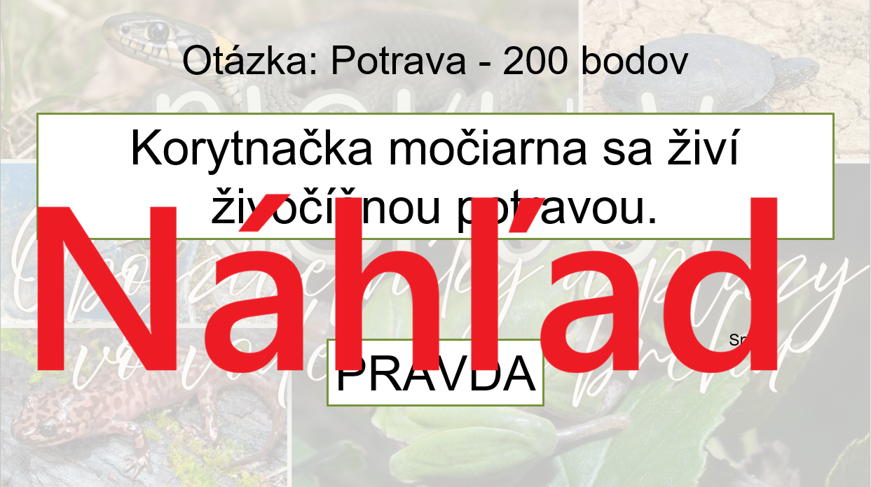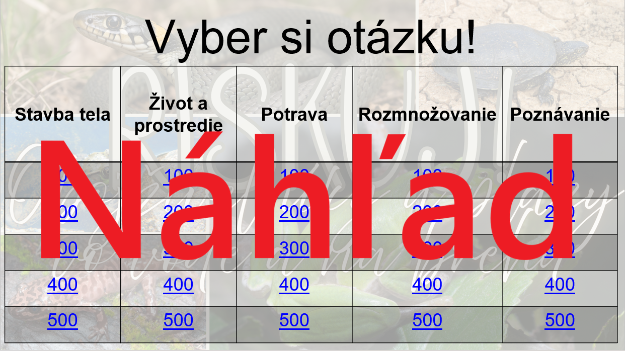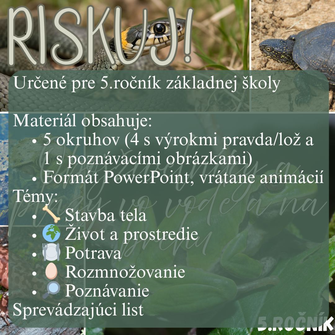 Materiál „RISKUJ! – Obojživelníky a plazy vo vode a na brehu“ je interaktívna a súťažná edukačná hra určená pre žiakov 5. ročníka základnej školy na hodiny biológie. Tematicky je zameraná na stavbu tela, spôsob života, potravu, rozmnožovanie a určovanie vybraných druhov obojživelníkov a plazov.