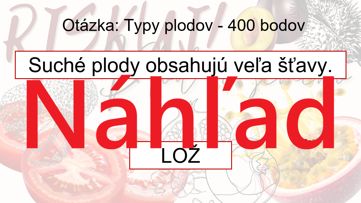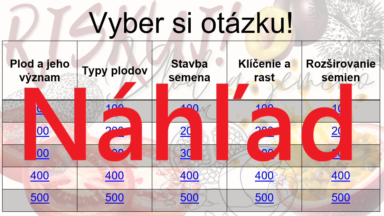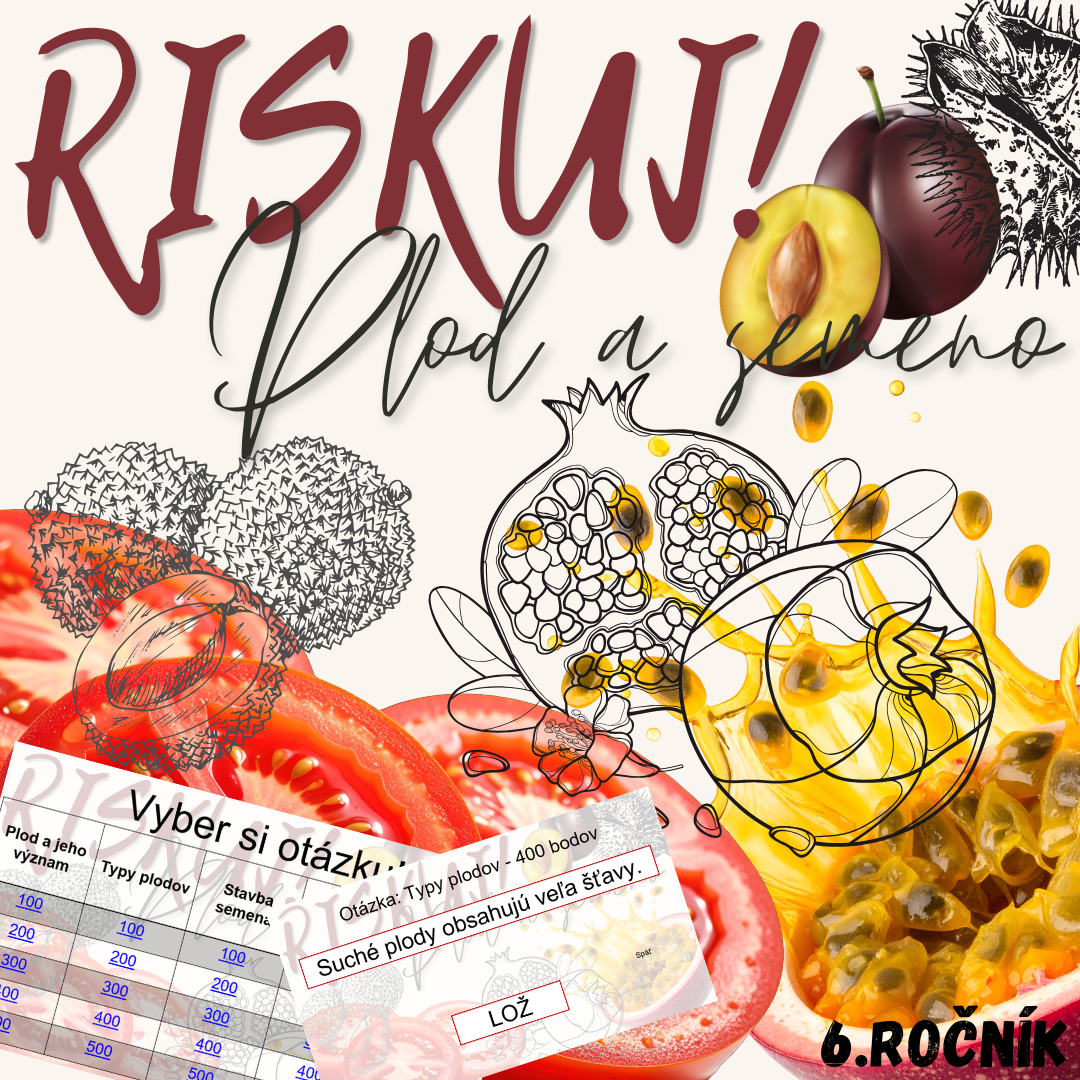 Materiál „RISKUJ! – Plod a semeno“ je interaktívna a súťažná edukačná hra určená pre žiakov 6. ročníka základnej školy na hodiny biológie. Zameriava sa na význam plodov a semien, ich stavbu, typy a proces klíčenia.