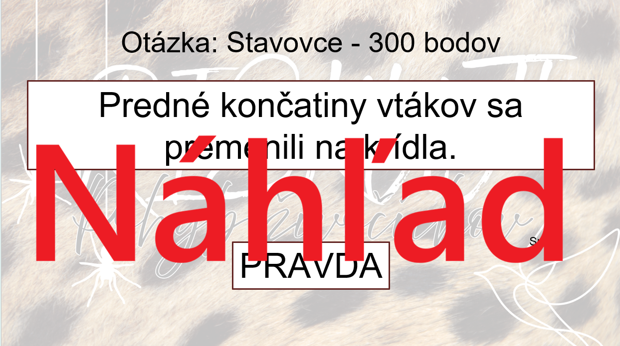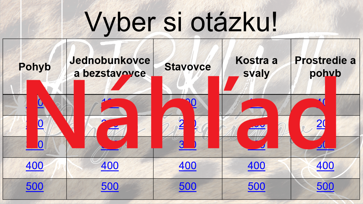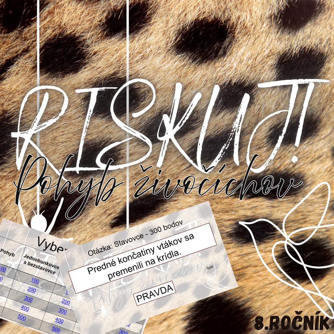 Materiál „RISKUJ! – Pohyb živočíchov“ je interaktívna a súťažná edukačná hra určená pre žiakov 8. ročníka základnej školy na hodiny biológie. Hravou formou pomáha zopakovať, upevniť a prehĺbiť poznatky o pohybe živočíchov, o stavbe ich tela a o prispôsobení sa rôznym životným podmienkam.