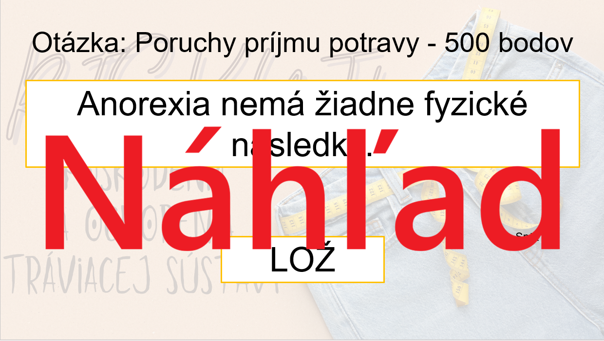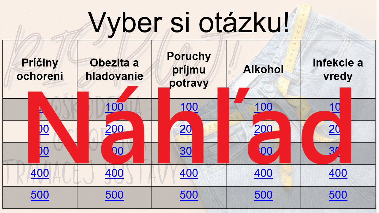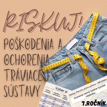 Materiál „RISKUJ! – Poškodenia a ochorenia tráviacej sústavy“ je interaktívna a súťažná edukačná hra určená pre žiakov 7. ročníka základnej školy na hodiny biológie. Aktivita je spracovaná k téme ochorenia tráviacej sústavy a hravou formou pomáha zopakovať, upevniť a prehĺbiť poznatky o ich príčinách, prejavoch a prevencii.