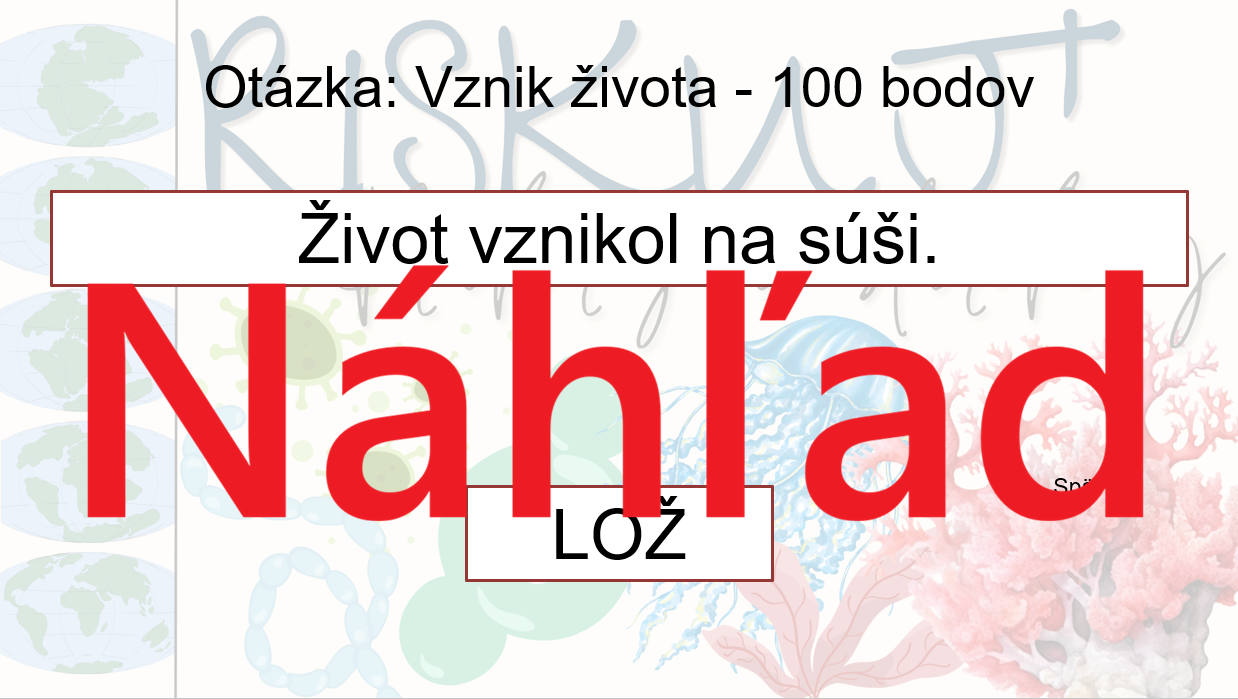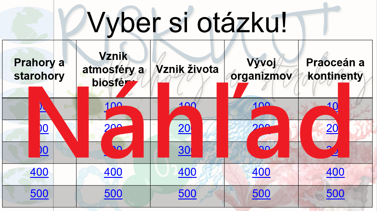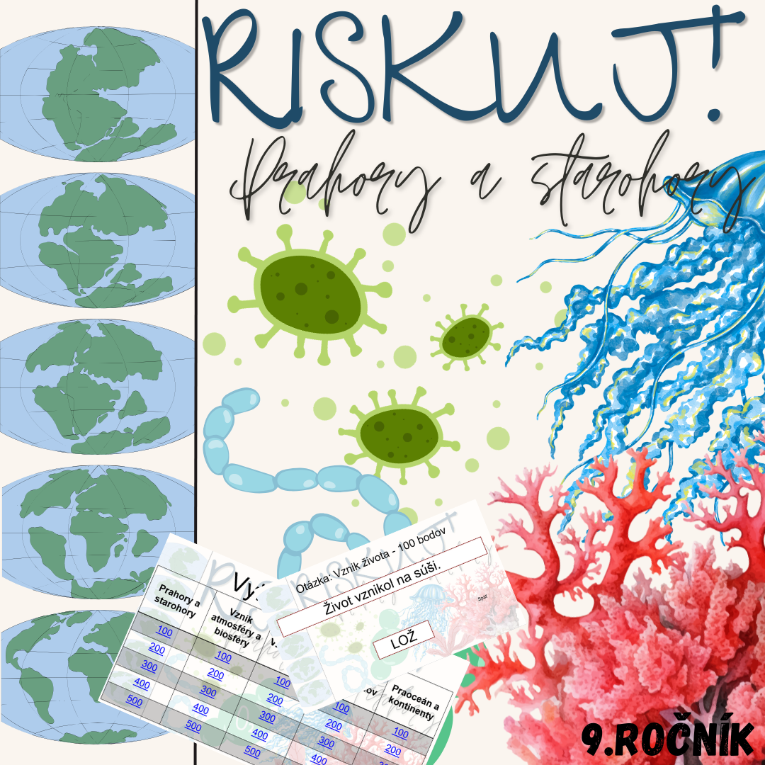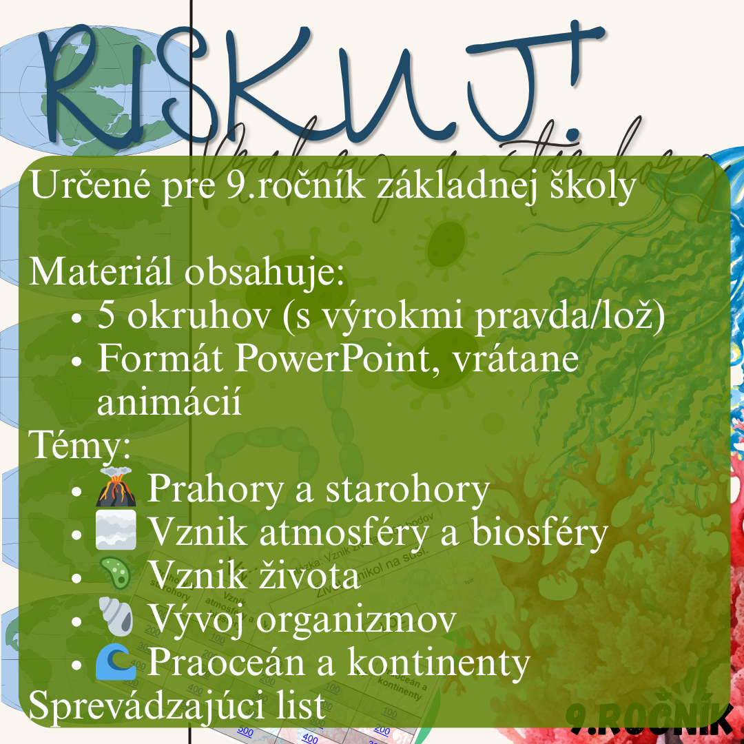 Materiál „RISKUJ! – Prahory a starohory“ je interaktívna a súťažná edukačná hra určená pre žiakov 9. ročníka základnej školy na hodiny biológie. Zameriava sa na najstaršie obdobia vývoja Zeme, vznik atmosféry a biosféry, vznik života a vývoj prvých organizmov.