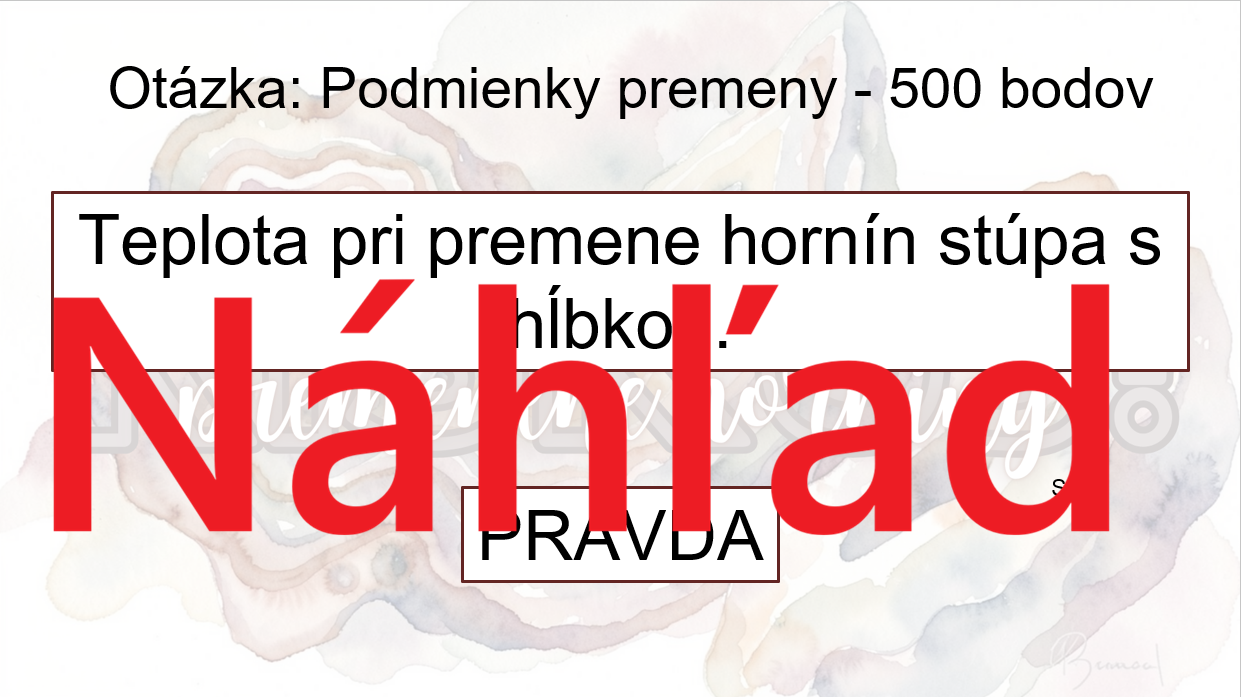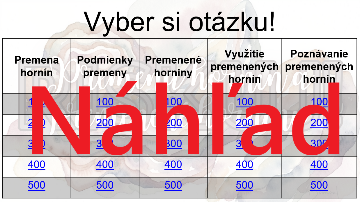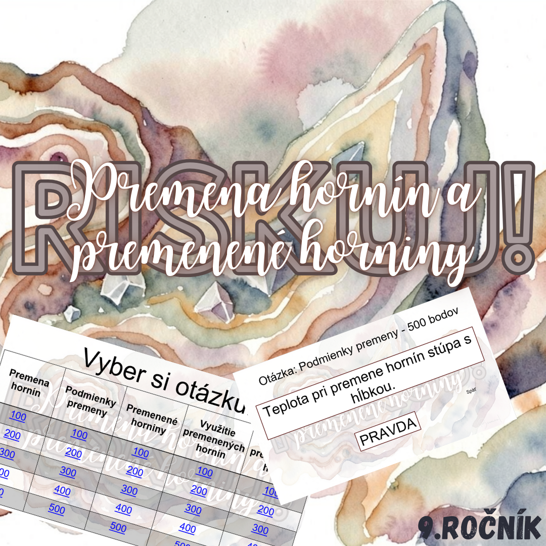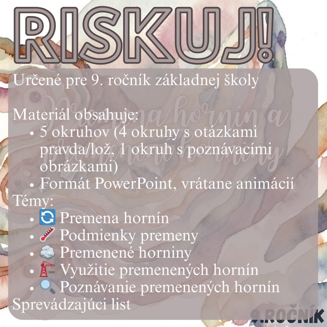 Materiál „RISKUJ! – Premena hornín a premenené horniny“ je interaktívna a súťažná edukačná hra určená pre žiakov 9. ročníka základnej školy na hodiny biológie. Hravou formou pomáha zopakovať, upevniť a prehĺbiť poznatky o premene hornín (metamorfóze), podmienkach jej vzniku a o základných druhoch premenených hornín a ich praktickom využití.