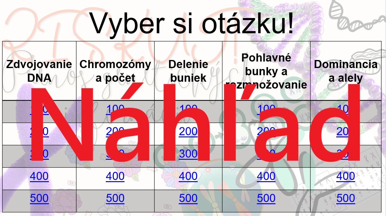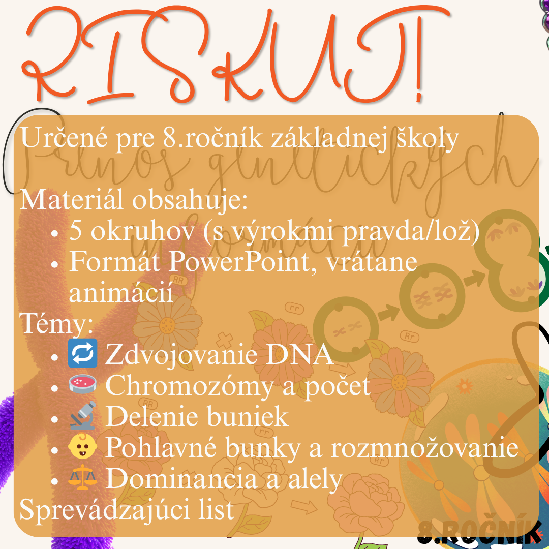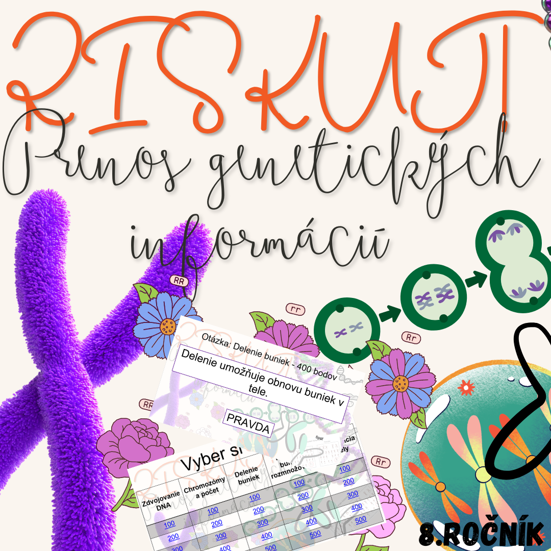 Materiál „RISKUJ! – Prenos genetických informácií“ je interaktívna a súťažná edukačná hra určená pre žiakov 8. ročníka základnej školy. Zameriava sa na mechanizmy prenosu genetickej informácie a princípy dedičnosti.