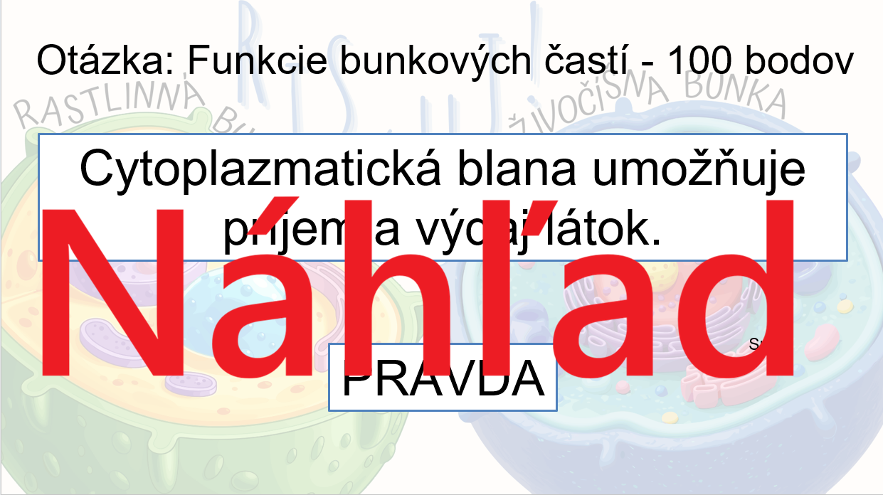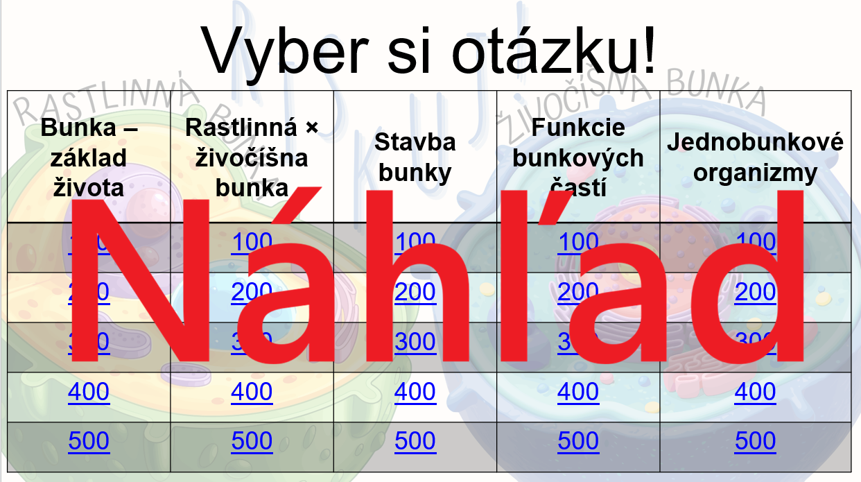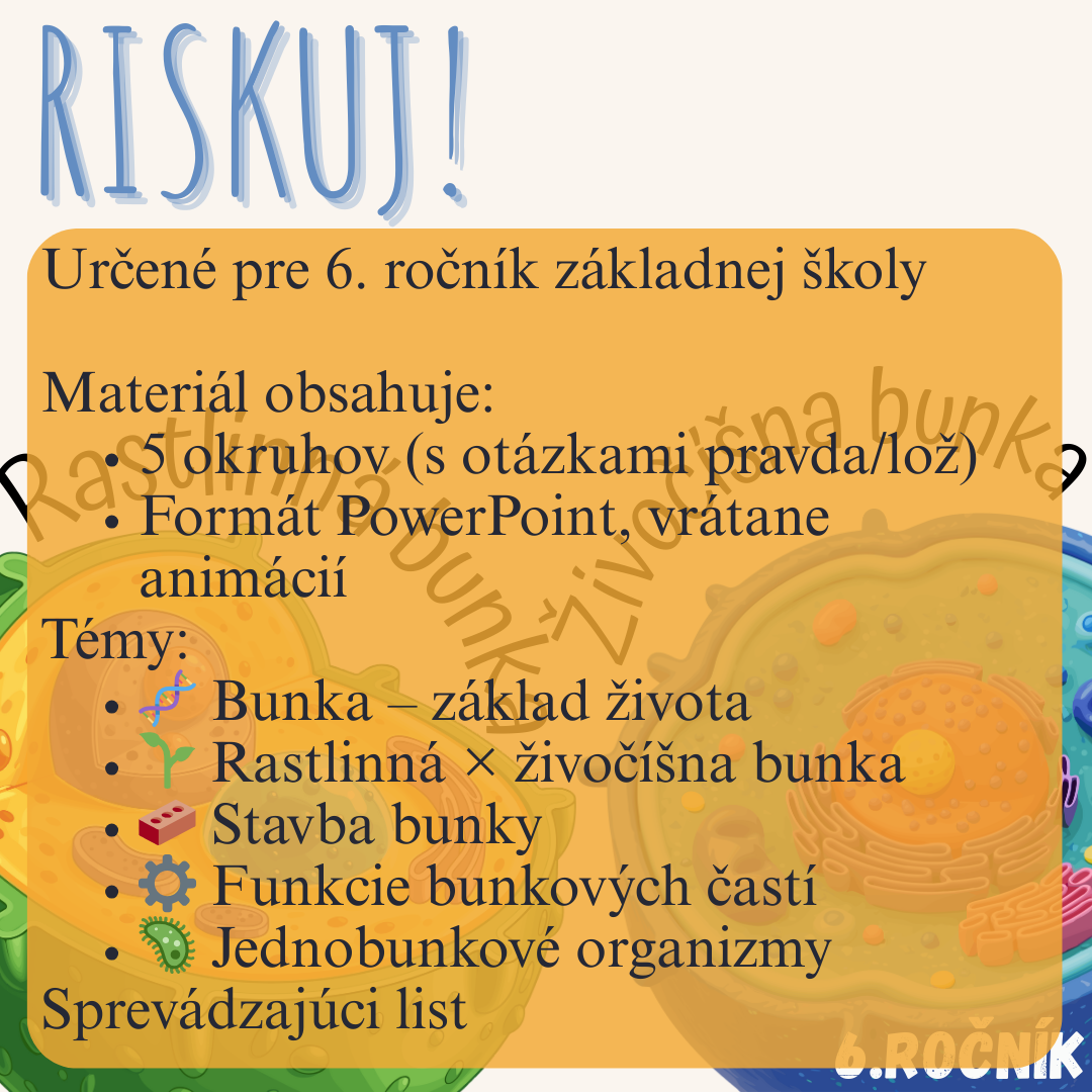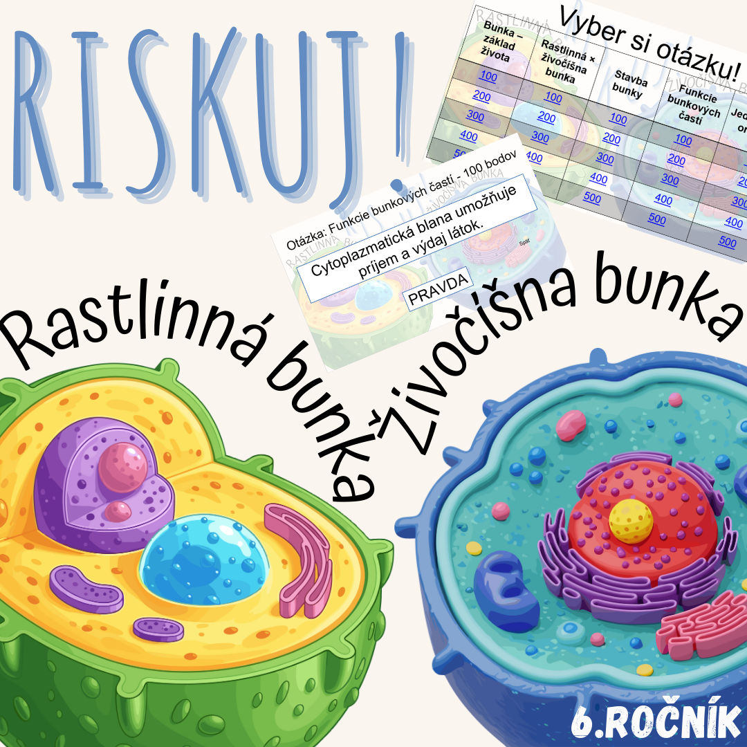 Materiál „RISKUJ! – Rastlinná a živočíšna bunka“ je interaktívna a súťažná edukačná hra určená pre žiakov 6. ročníka základnej školy. Hravou formou pomáha zopakovať, upevniť a prehĺbiť poznatky o bunke ako základnej stavebnej a funkčnej jednotke všetkých živých organizmov.