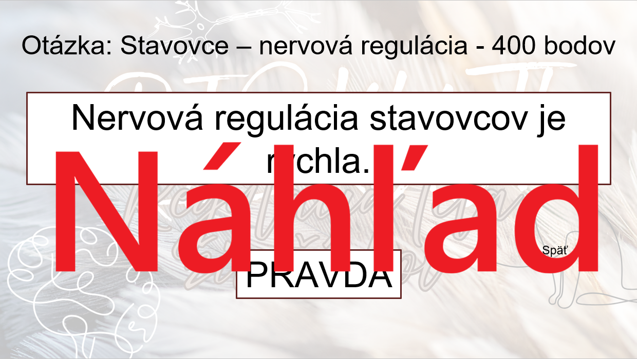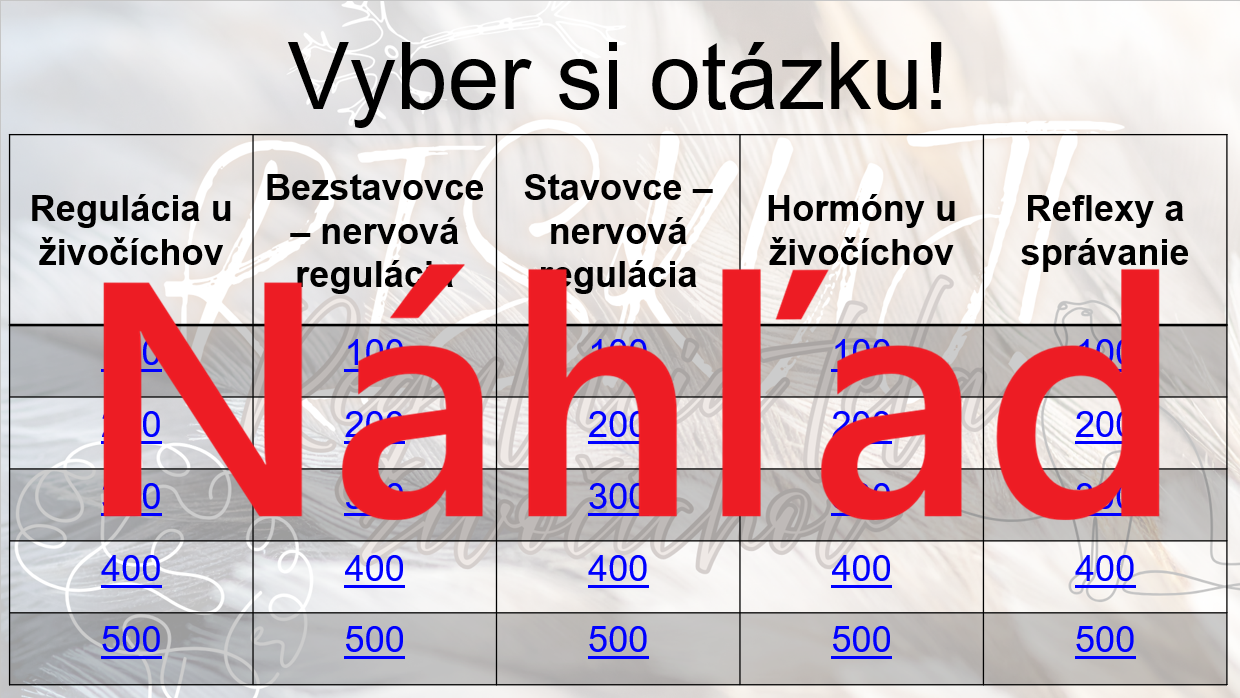 Materiál „RISKUJ! – Regulácia tela živočíchov“ je interaktívna a súťažná edukačná hra určená pre žiakov 8. ročníka základnej školy na hodiny biológie. Hravou formou pomáha zopakovať, upevniť a prehĺbiť poznatky o regulačných mechanizmoch tela živočíchov, ktoré zabezpečujú koordináciu činností orgánov, reakcie na podnety a udržiavanie vnútornej rovnováhy organizmu.