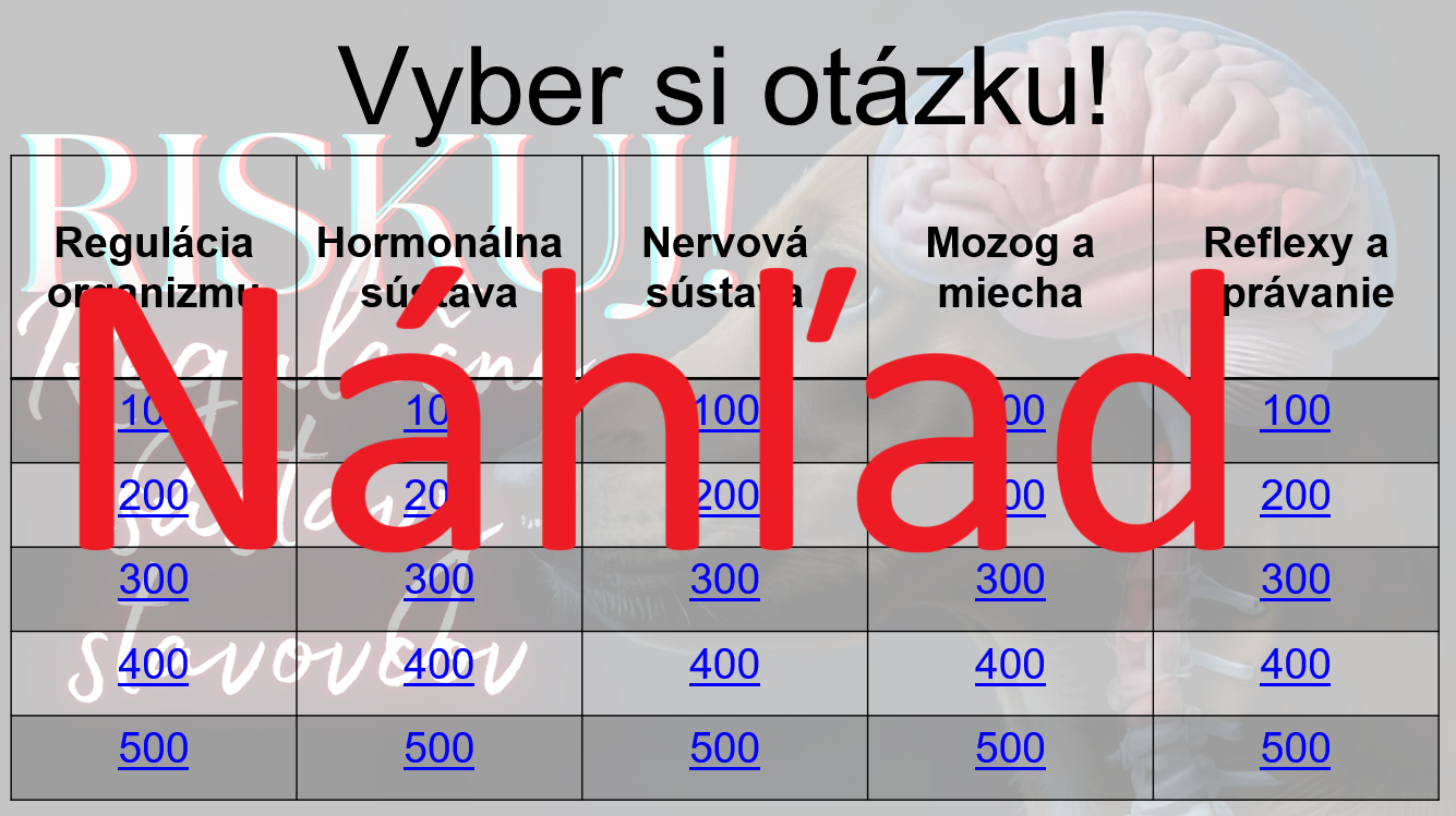 Hra je inšpirovaná známou televíznou súťažou Riskuj! – žiaci si vyberajú otázky z piatich tematických okruhov podľa obtiažnosti (100 – 500 bodov) a odpovedajú na výroky typu pravda/lož.