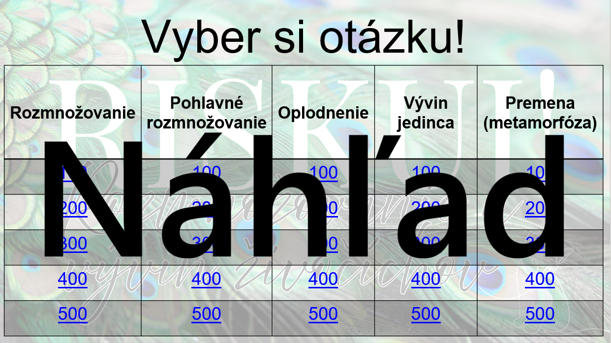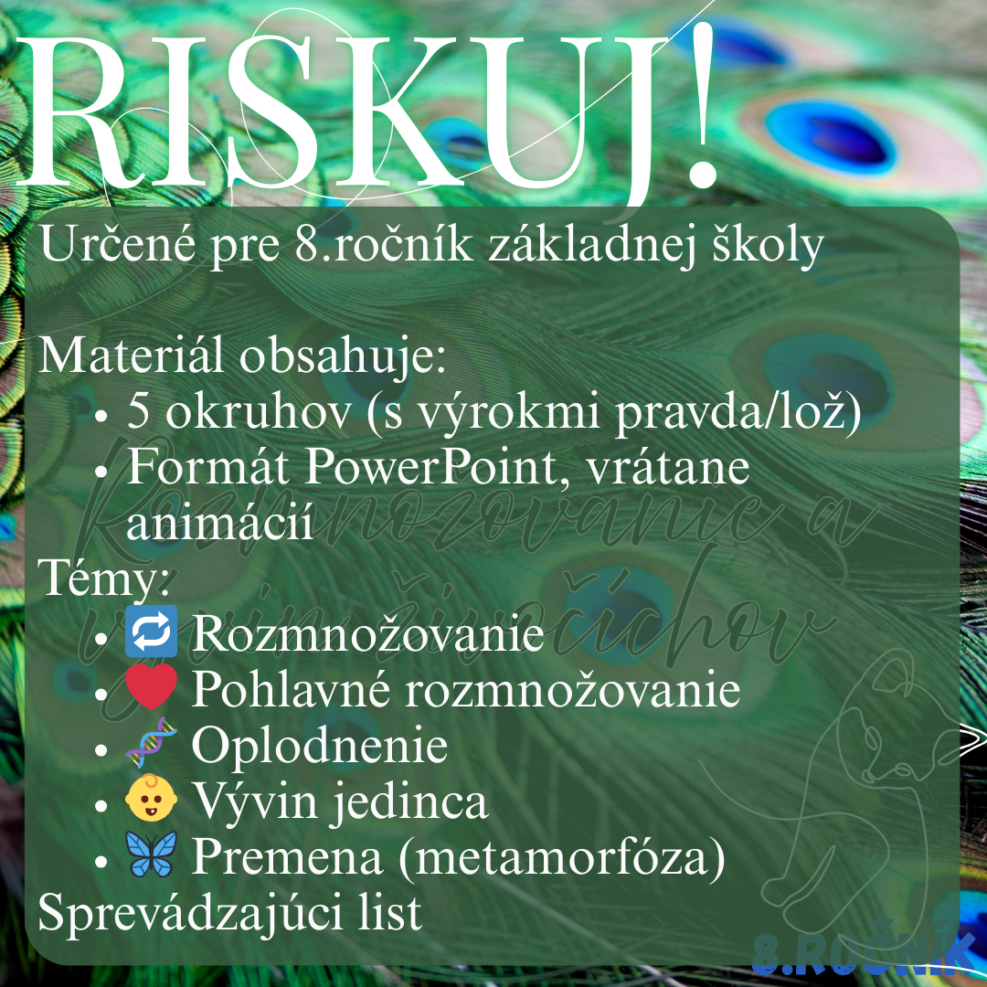 Materiál „RISKUJ! – Rozmnožovanie a vývin živočíchov“ je interaktívna a súťažná edukačná hra určená pre žiakov 8. ročníka základnej školy na hodiny biológie. Aktivita je spracovaná k téme rozmnožovanie a vývin živočíchov a hravou formou pomáha zopakovať, upevniť a prehĺbiť poznatky o základných biologických procesoch zabezpečujúcich pokračovanie druhu.