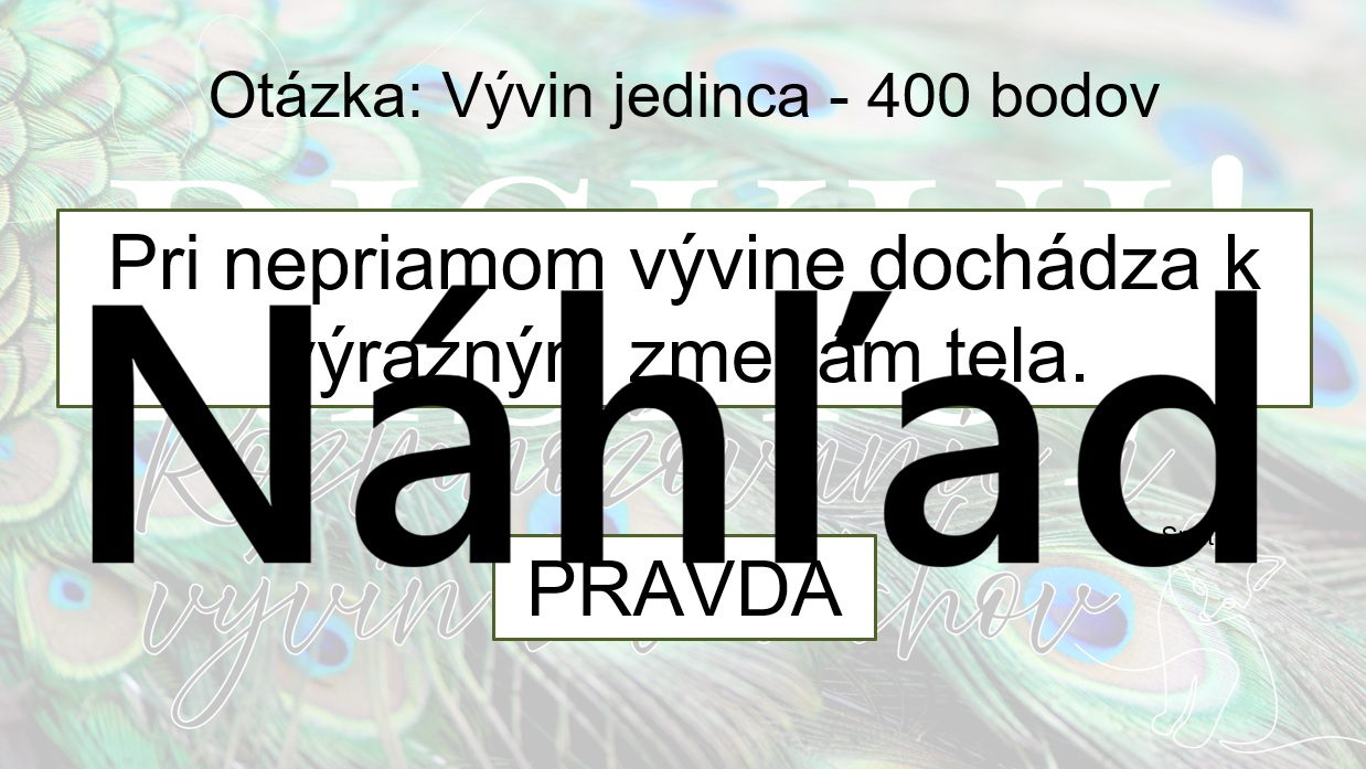 Žiaci si prostredníctvom súťažnej hry upevňujú poznatky o rozmnožovaní, pohlavnom rozmnožovaní, oplodnení, vývine jedinca a premene (metamorfóze). Učia sa rozlišovať priamy a nepriamy vývin, chápať význam oplodnenia a identifikovať príklady premeny u vybraných skupín živočíchov. Aktivita podporuje tímovú spoluprácu, súťaživosť, pozornosť a logické myslenie.
