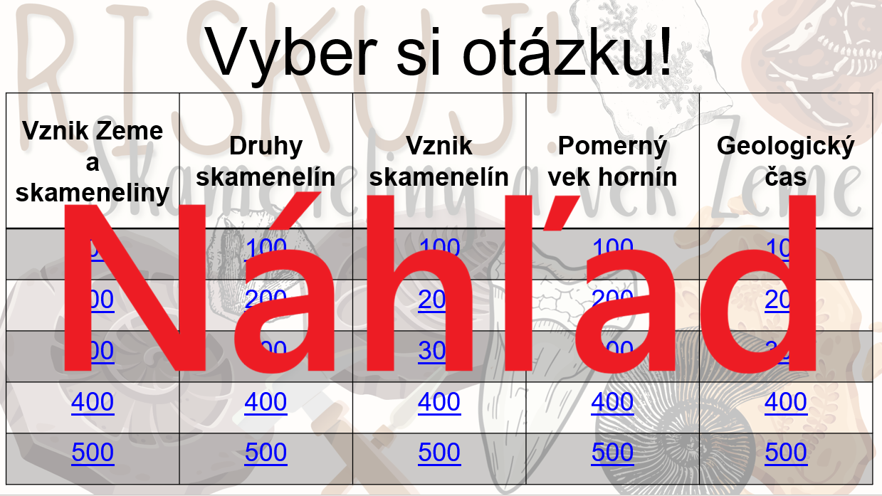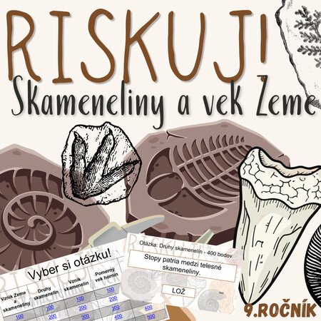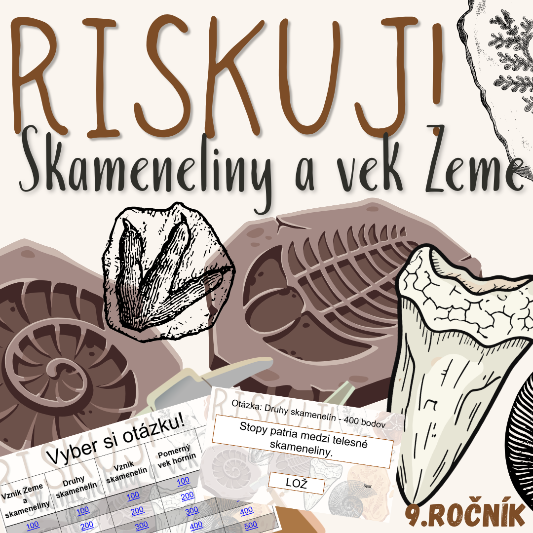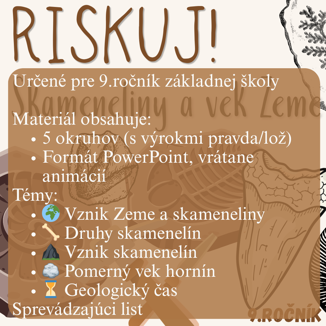 Materiál „RISKUJ! – Skameneliny a vek Zeme“ je interaktívna a súťažná edukačná hra určená pre žiakov 9. ročníka základnej školy na hodiny biológie. Zameriava sa na vznik Zeme, význam a druhy skamenelín, určovanie veku hornín a orientáciu v geologickom čase.
