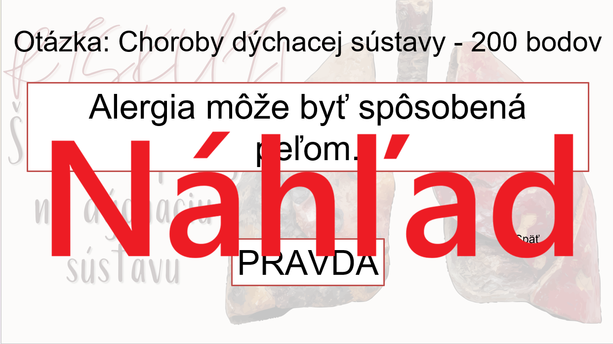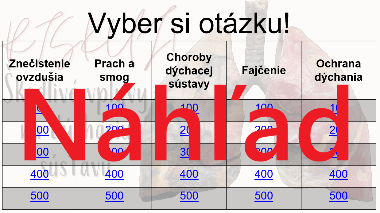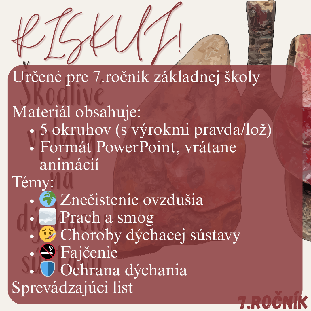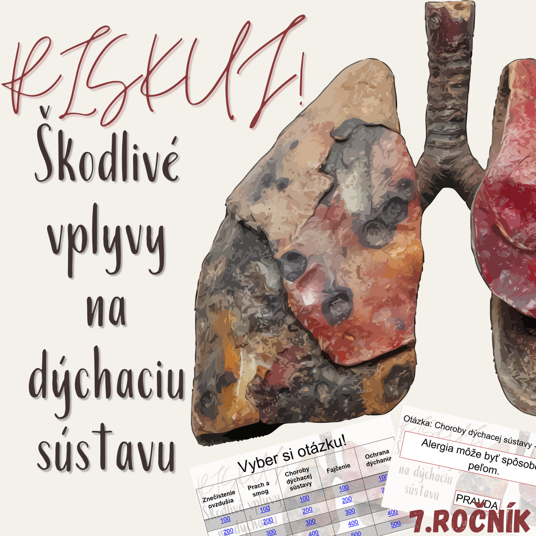 Materiál „RISKUJ! – Škodlivé vplyvy na dýchaciu sústavu“ je interaktívna a súťažná edukačná hra určená pre žiakov 7. ročníka základnej školy na hodiny biológie. Aktivita je tematicky zameraná na faktory, ktoré negatívne ovplyvňujú dýchaciu sústavu, a hravou formou pomáha zopakovať, upevniť a prehĺbiť poznatky o prevencii a ochrane zdravia.