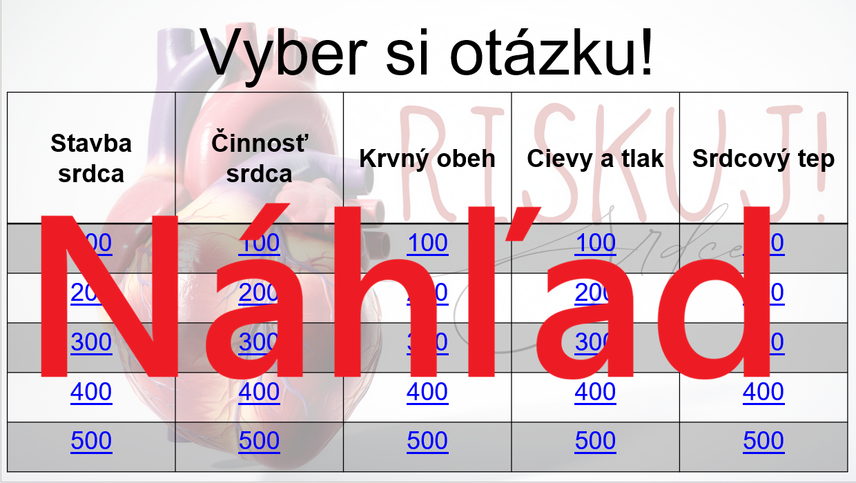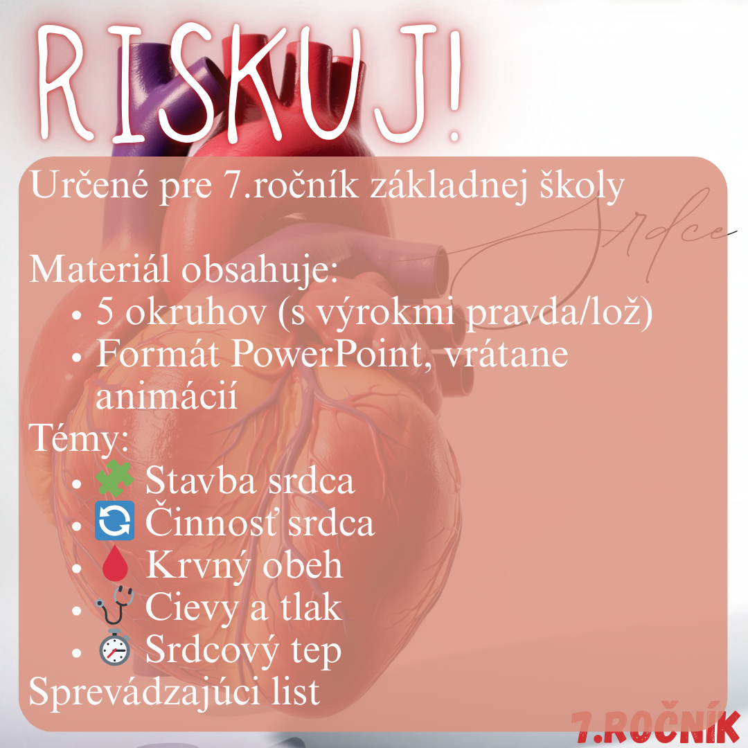 Materiál „RISKUJ! – Srdce“ je interaktívna a súťažná edukačná hra určená pre žiakov 7. ročníka základnej školy na hodiny biológie. Aktivita je tematicky zameraná na stavbu a činnosť srdca a hravou formou pomáha zopakovať, upevniť a prehĺbiť poznatky o jeho význame pre obehovú sústavu.
