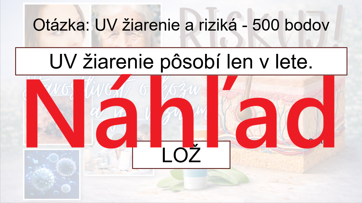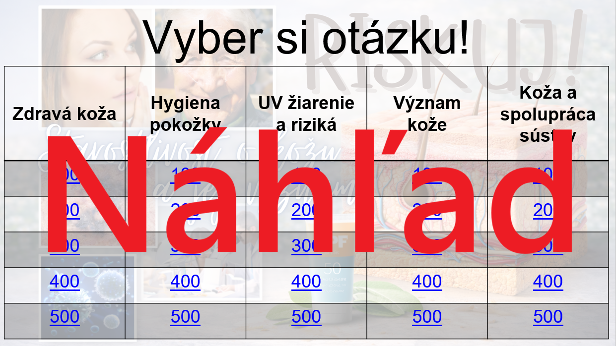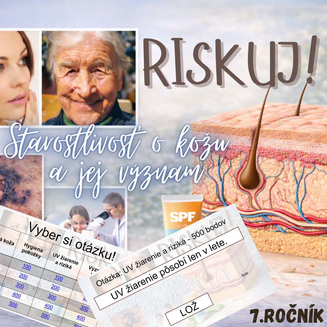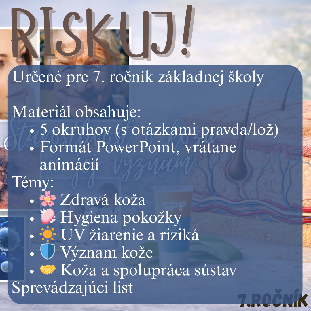 Materiál „RISKUJ! – Starostlivosť o kožu a jej význam“ je interaktívna a súťažná edukačná hra určená pre žiakov 7. ročníka základnej školy. Hravou formou pomáha zopakovať, upevniť a prehĺbiť poznatky o koži ako dôležitom orgáne ľudského tela, o jej funkciách, význame pre zdravie a zásadách správnej starostlivosti o pokožku.