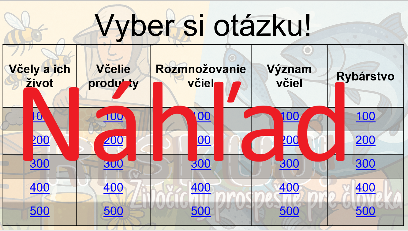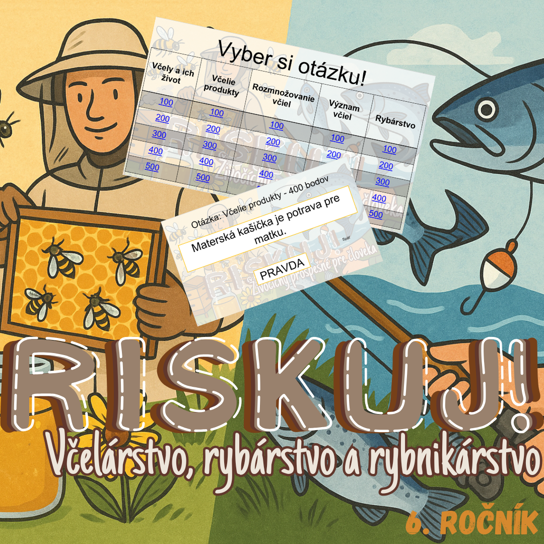 Materiál RISKUJ! – Včelárstvo, rybárstvo a rybnikárstvo je interaktívna a hravá aktivita, ktorá pomáha žiakom 6. ročníka základnej školy upevniť a rozšíriť poznatky o živočíchoch, ktoré majú významný prínos pre človeka. Zameriava sa najmä na včely – ich život, rozmnožovanie, produkty a ekologický význam, a taktiež na rybárstvo ako dôležitú oblasť hospodárstva.