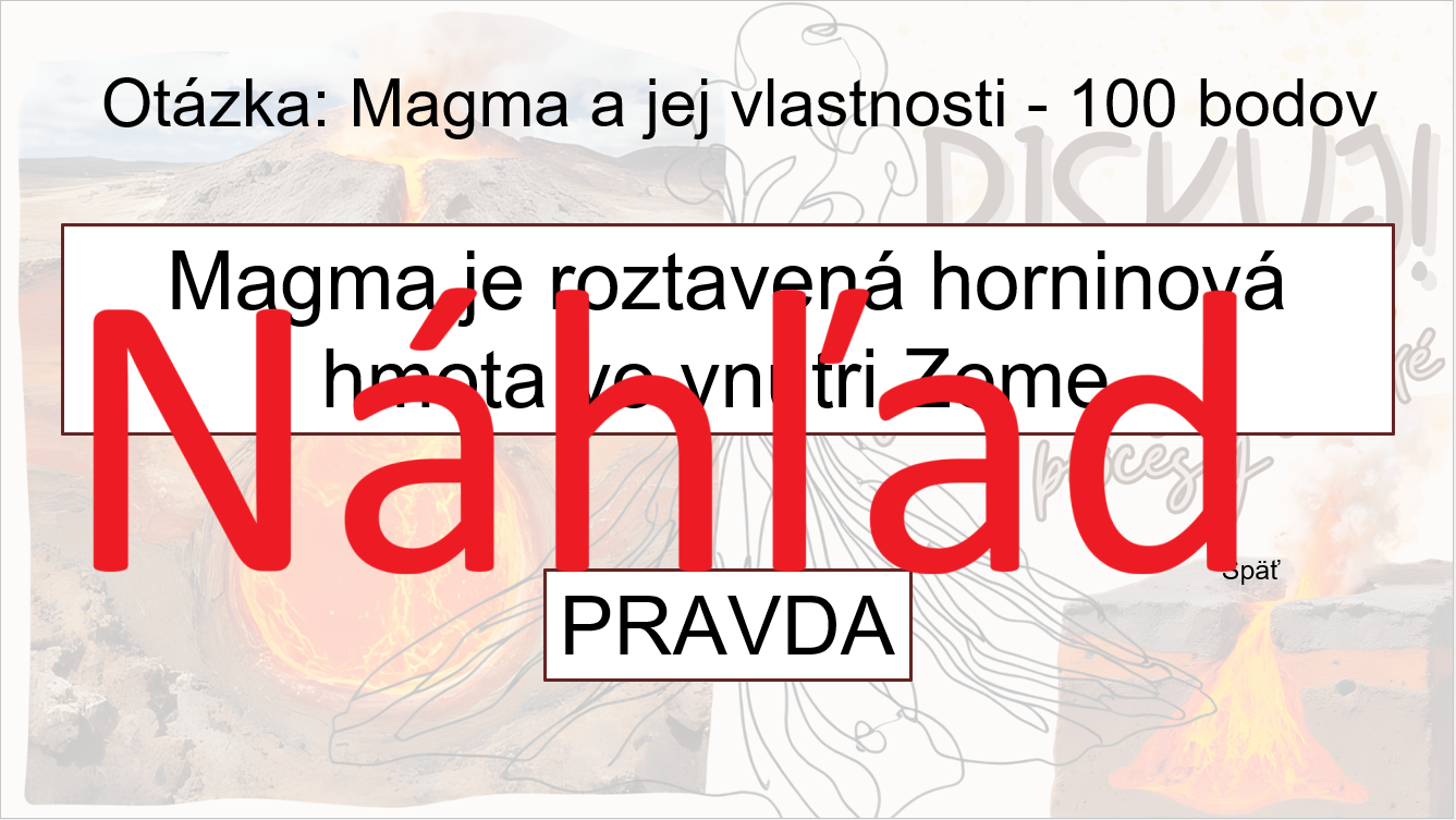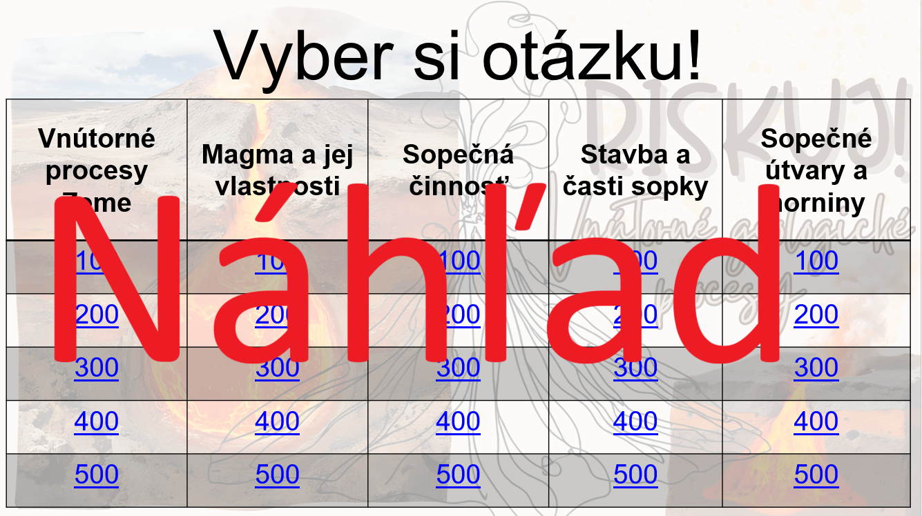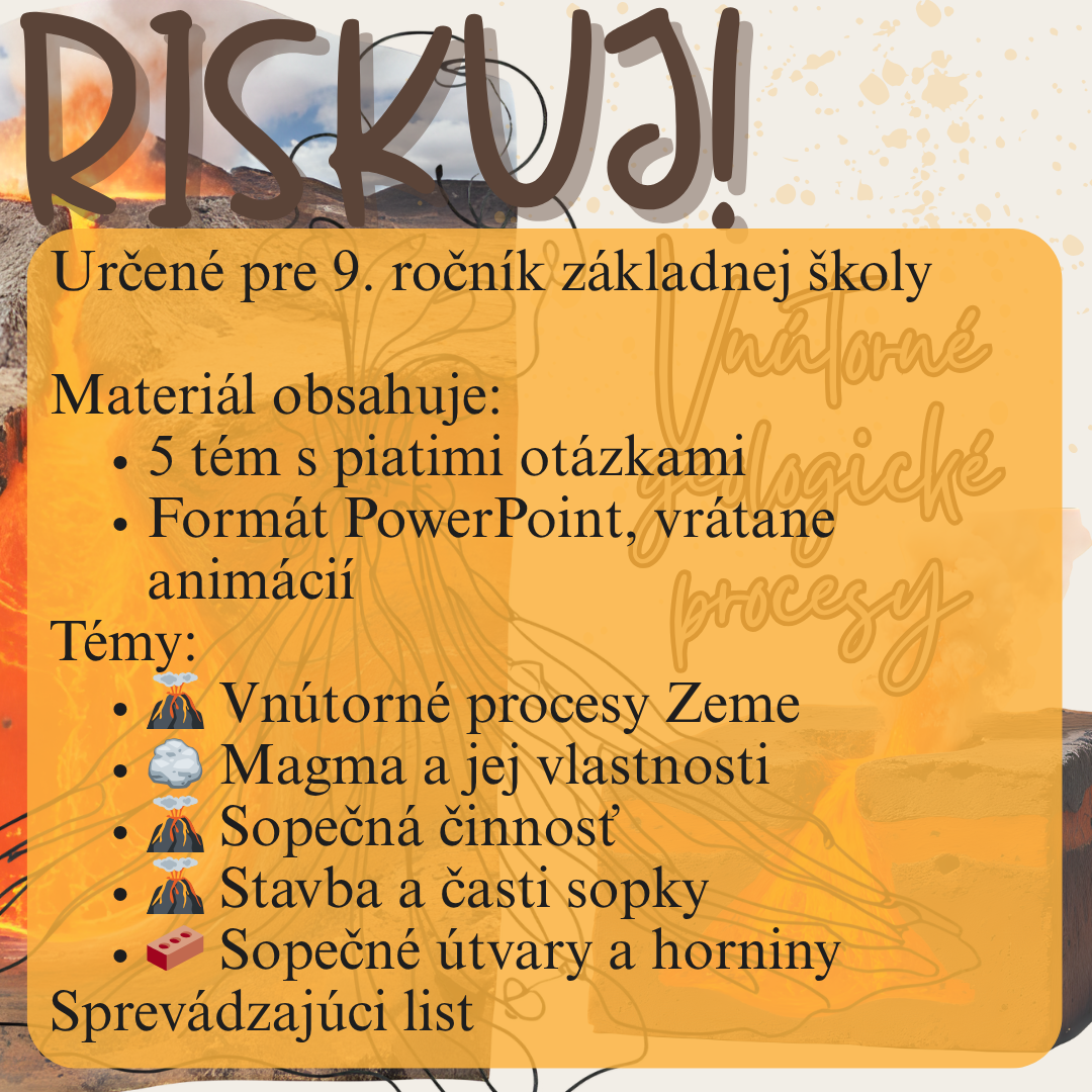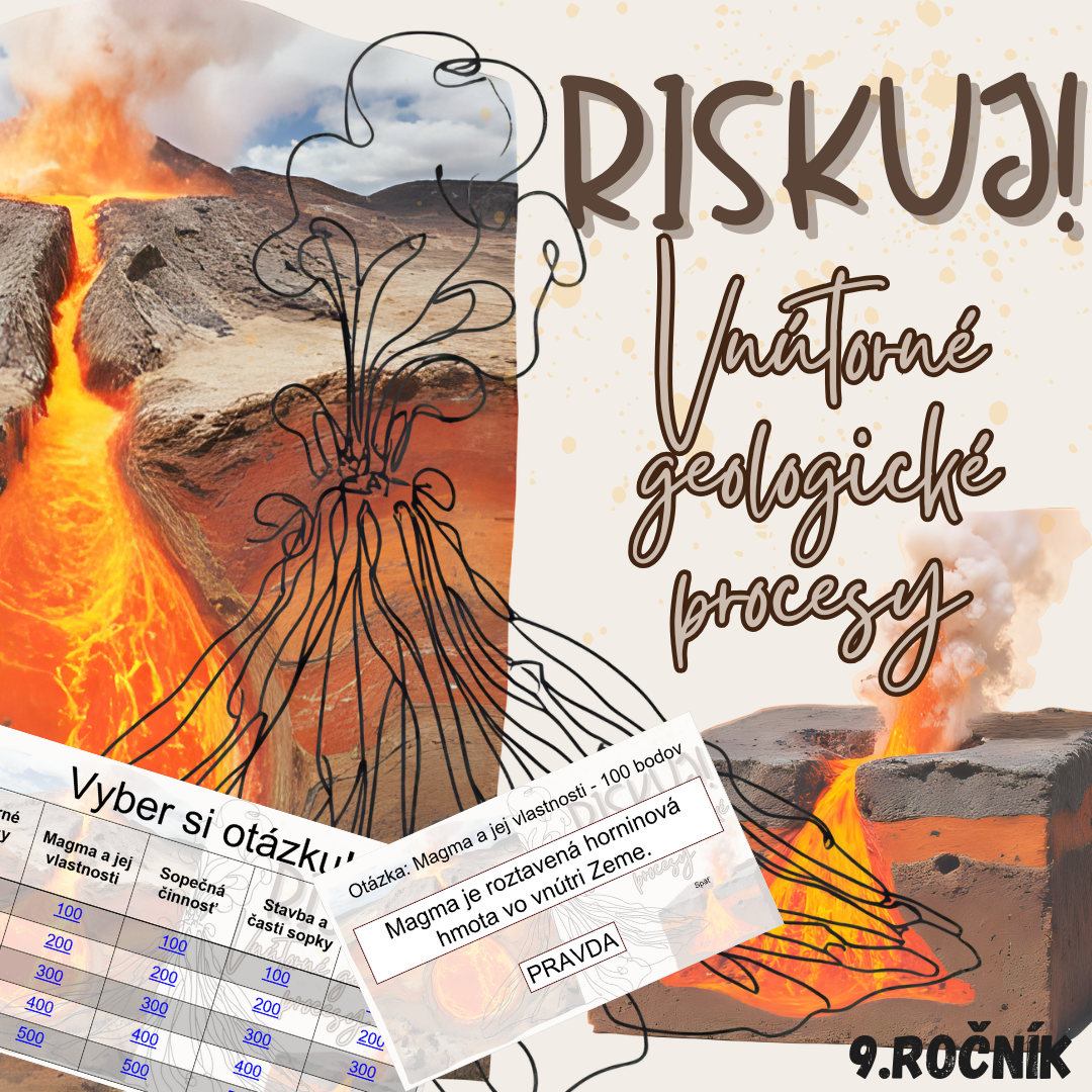 Materiál RISKUJ! – Vnútorné geologické procesy je interaktívna a zábavná aktivita určená pre žiakov 9. ročníka, ktorá pomáha pochopiť a upevniť poznatky o procesoch prebiehajúcich vo vnútri Zeme – o vzniku magmy, sopečnej činnosti a horninách, ktoré z nej vznikajú.