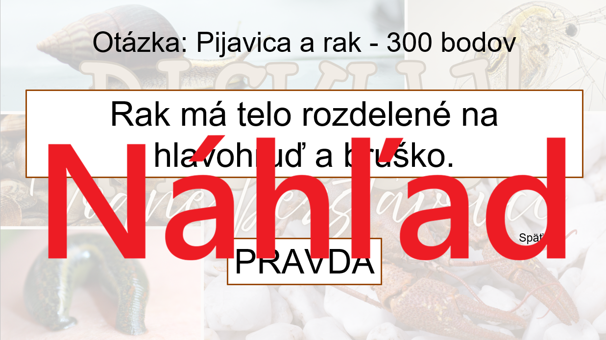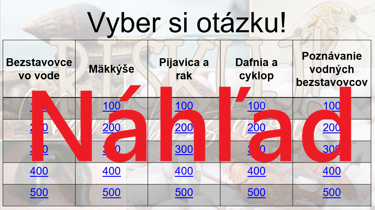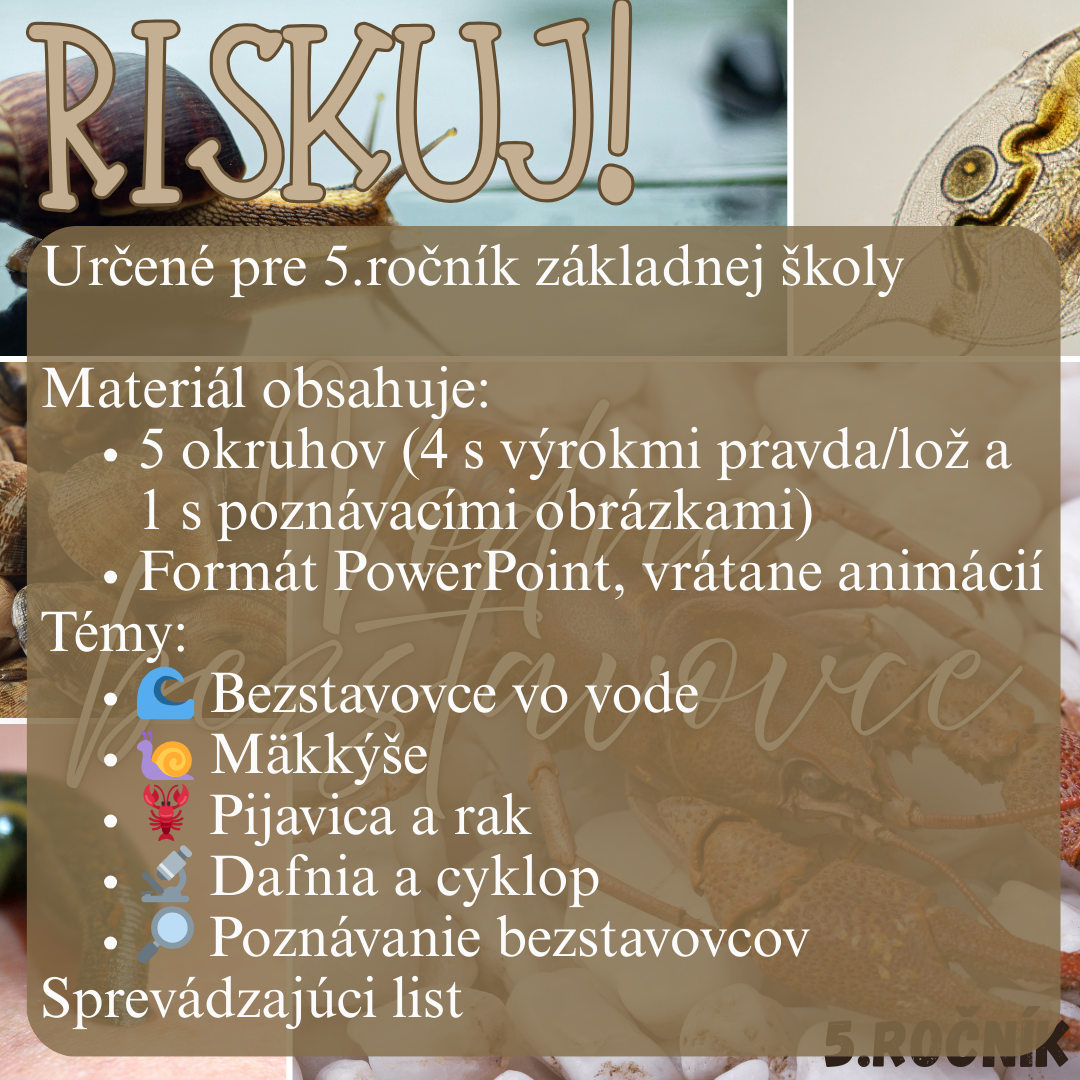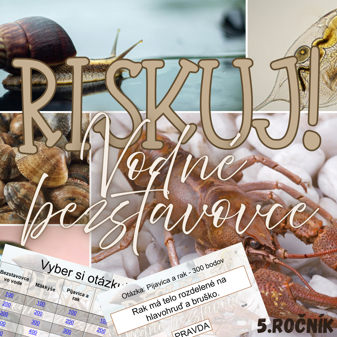 Materiál „RISKUJ! – Vodné bezstavovce“ je interaktívna a súťažná edukačná hra určená pre žiakov 5. ročníka základnej školy na hodiny biológie. Aktivita je tematicky zameraná na bezstavovce žijúce vo vodnom prostredí a hravou formou pomáha zopakovať, upevniť a prehĺbiť poznatky o ich stavbe, spôsobe života a význame pre vodné ekosystémy.