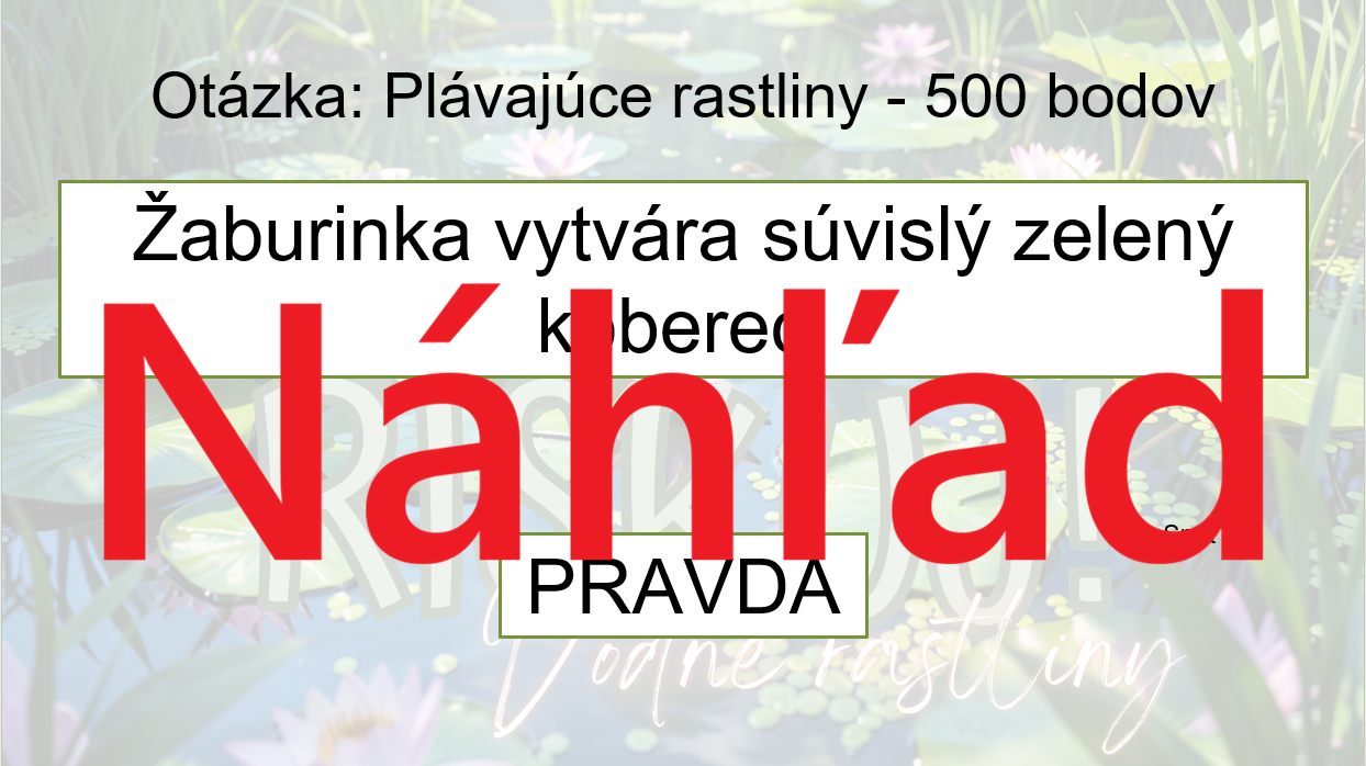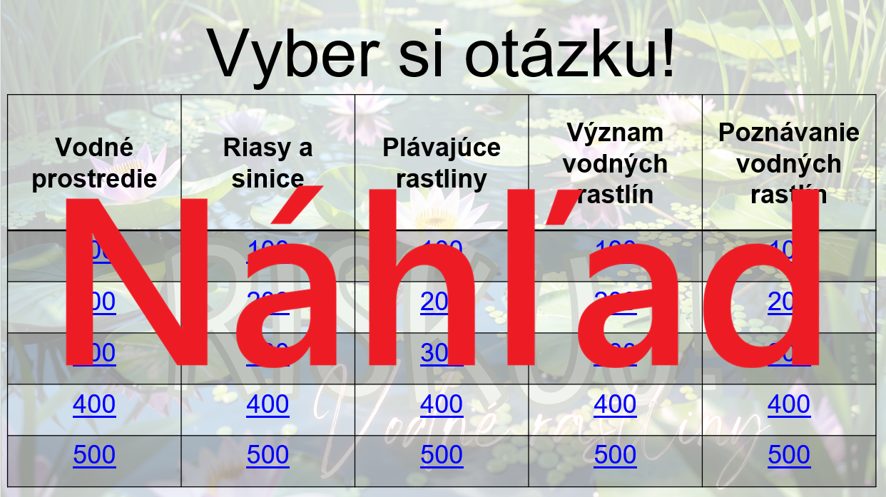 Materiál „RISKUJ! – Vodné rastliny“ je interaktívna a súťažná edukačná hra určená pre žiakov 5. ročníka základnej školy na hodiny biológie. Aktivita je spracovaná k téme vodné rastliny a hravou formou pomáha zopakovať, upevniť a prehĺbiť poznatky o ich stavbe, životnom prostredí a význame pre vodné ekosystémy.