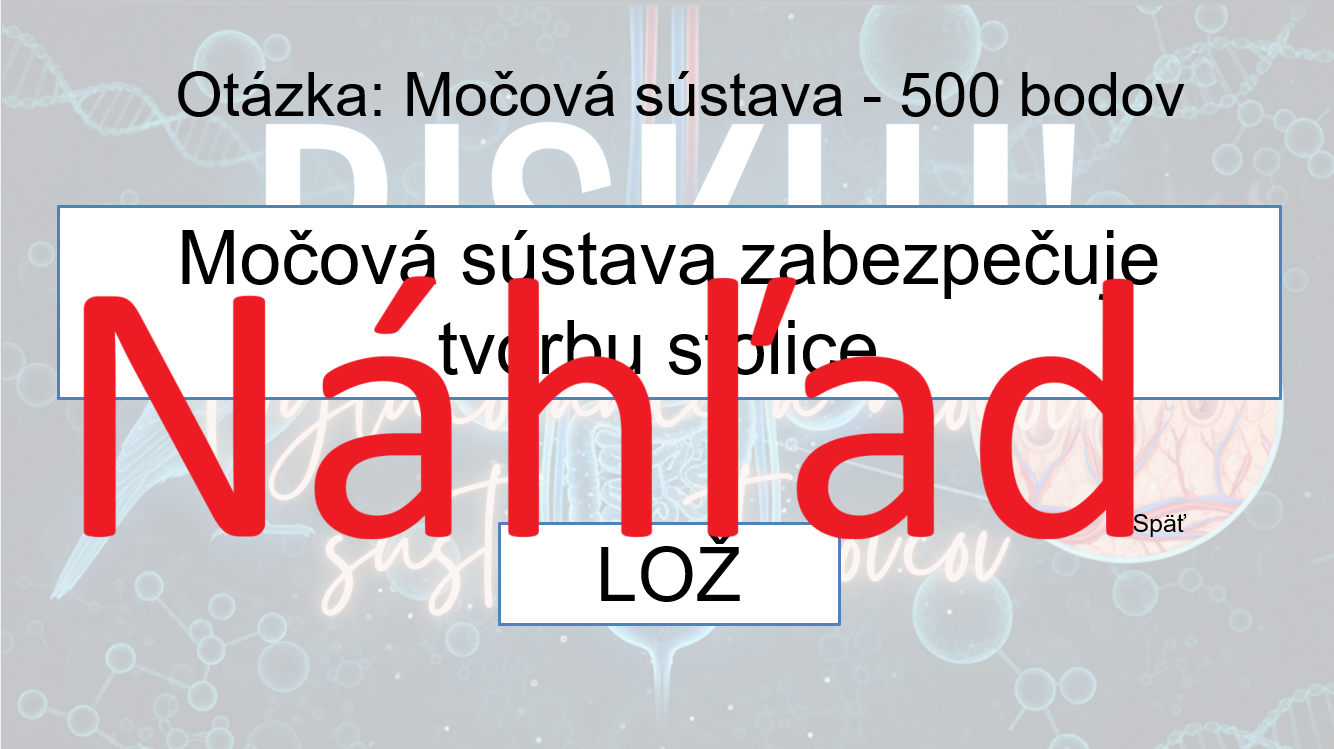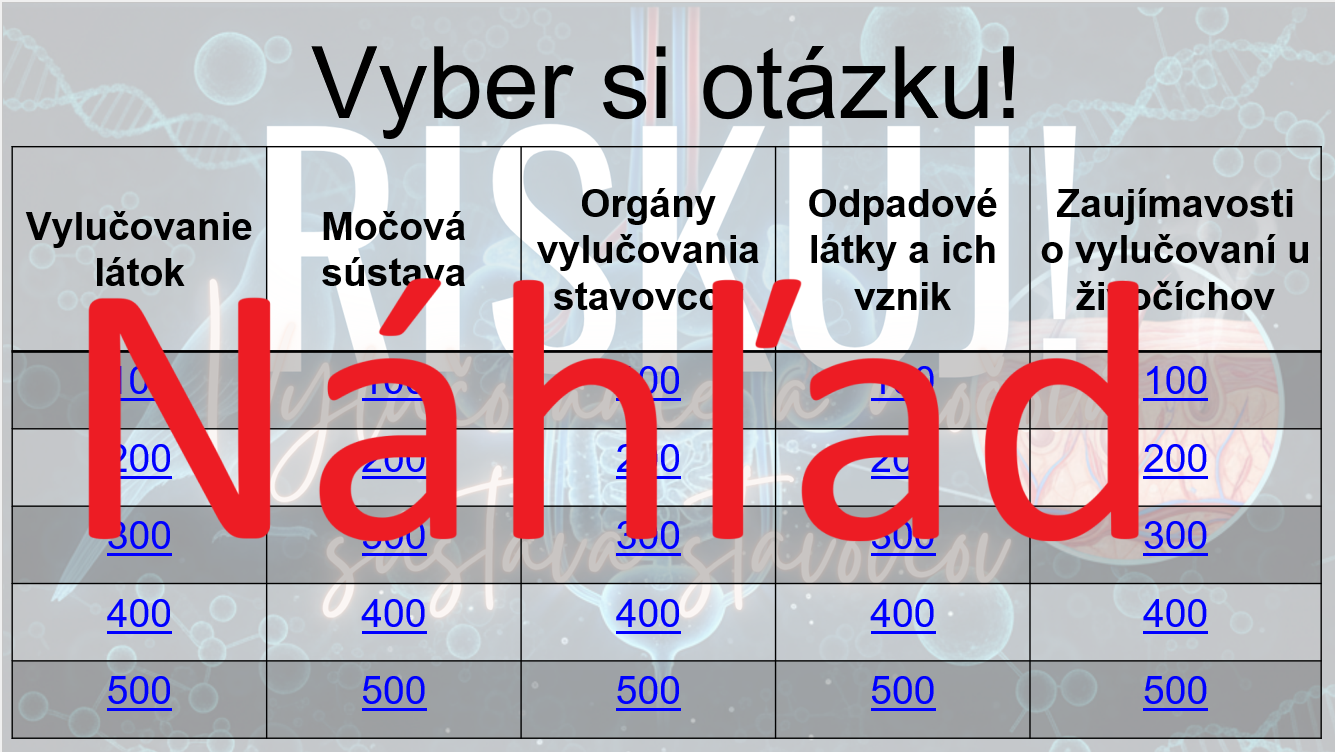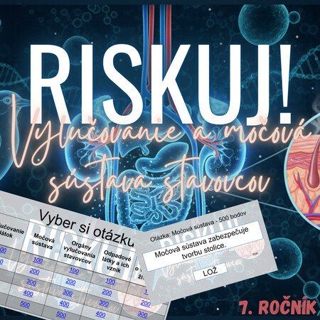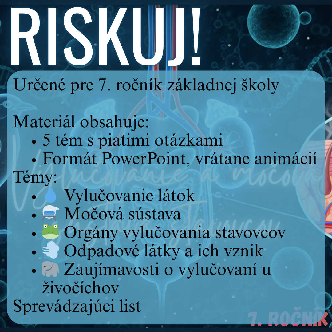 Materiál RISKUJ! – Vylučovanie a močová sústava stavovcov je interaktívna a zábavná aktivita, ktorá pomáha žiakom 7. ročníka základnej školy upevniť a rozšíriť poznatky o procese vylučovania, o stavbe a funkcii močovej sústavy a o orgánoch, ktoré zabezpečujú odstraňovanie odpadových látok z tela stavovcov.
