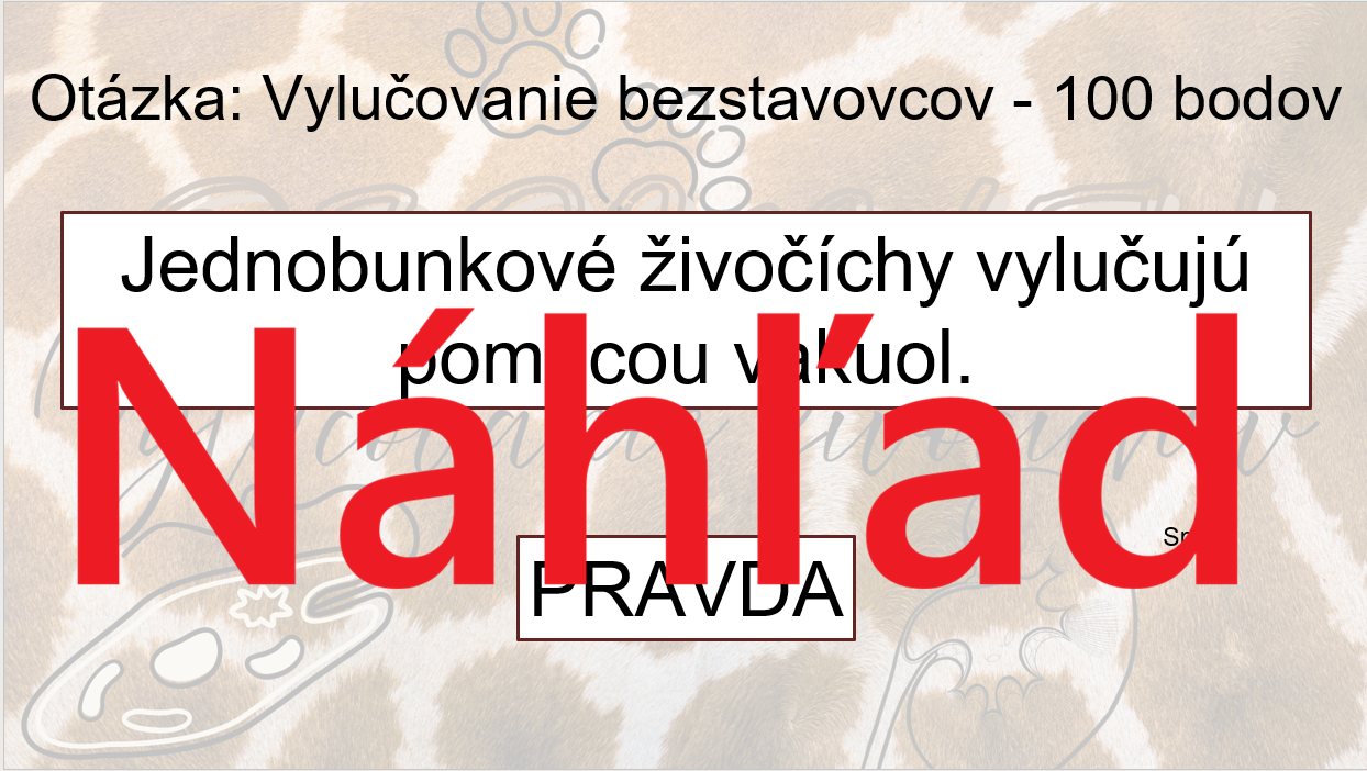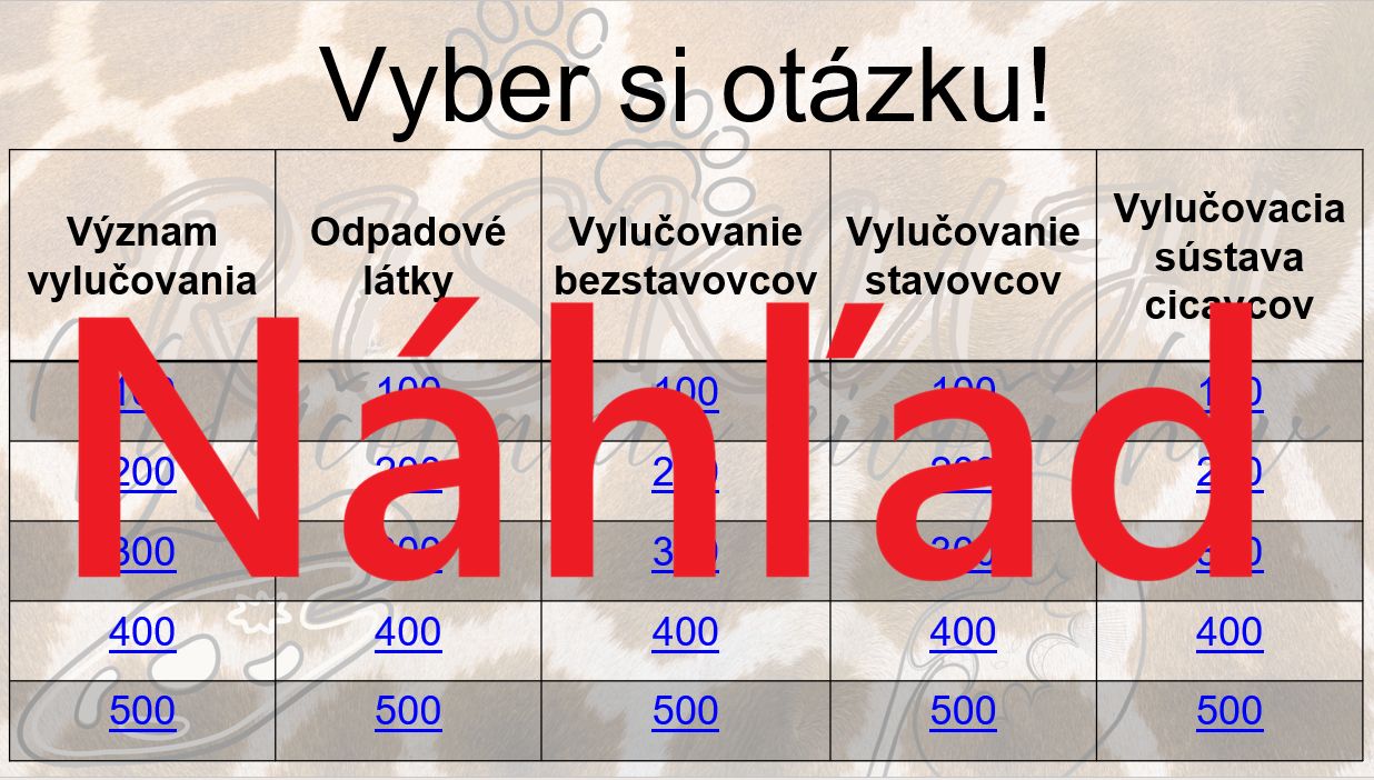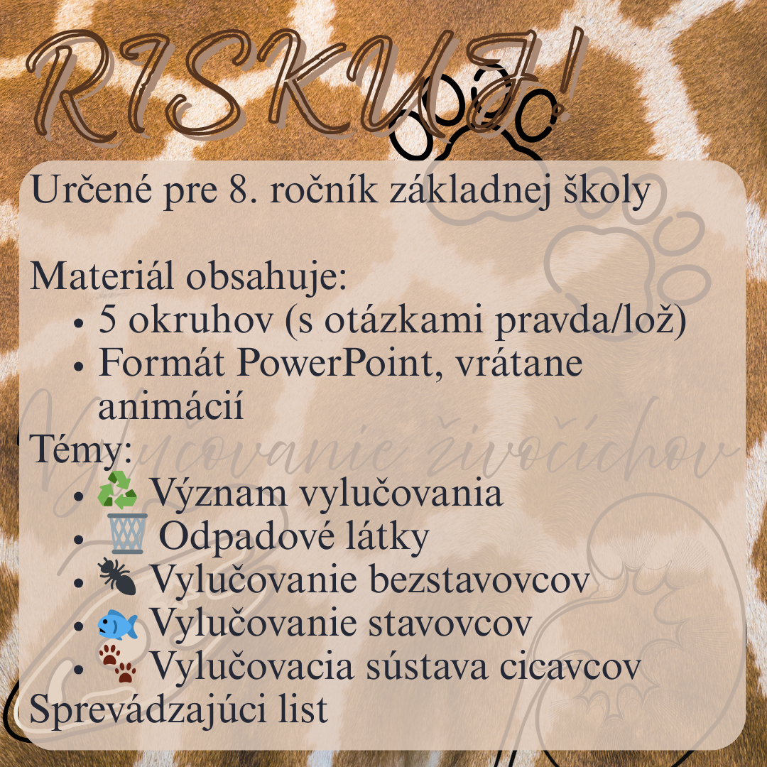 Materiál „RISKUJ! – Vylučovanie živočíchov“ je interaktívna a súťažná edukačná hra určená pre žiakov 8. ročníka základnej školy. Hravou formou pomáha zopakovať, upevniť a prehĺbiť poznatky o vylučovaní ako dôležitom životnom procese živočíchov, ktorý zabezpečuje odstraňovanie odpadových látok a udržiavanie rovnováhy vnútorného prostredia organizmu.