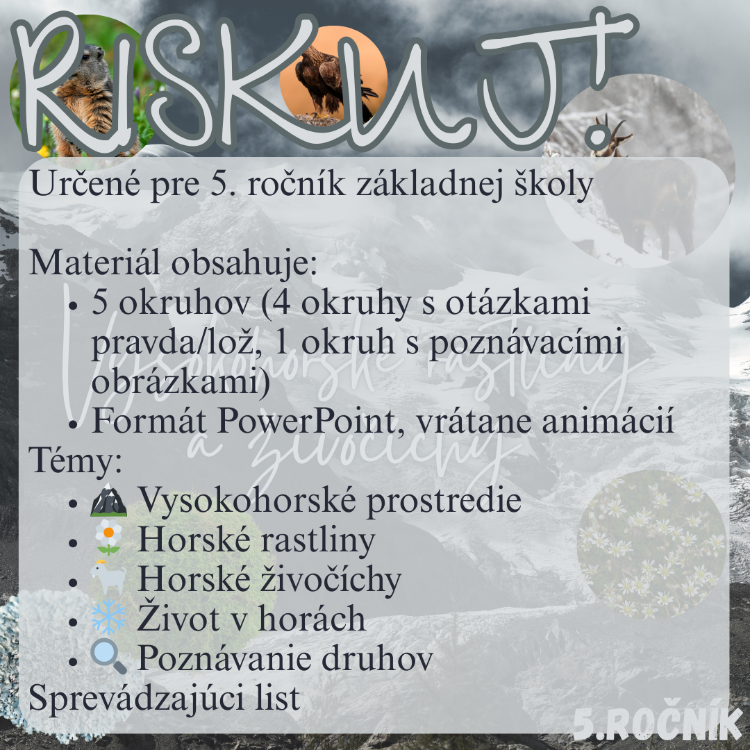 Materiál „RISKUJ! – Vysokohorské rastliny a živočíchy“ je interaktívna a súťažná edukačná hra určená pre žiakov 5. ročníka základnej školy. Hravou formou pomáha zopakovať, upevniť a rozšíriť poznatky o vysokohorskom prostredí, o rastlinách a živočíchoch žijúcich v horských oblastiach a o ich prispôsobení sa náročným životným podmienkam.
