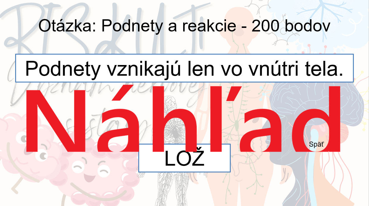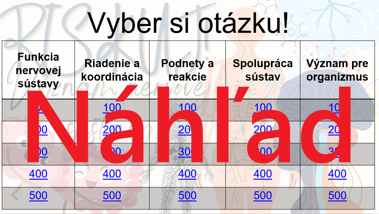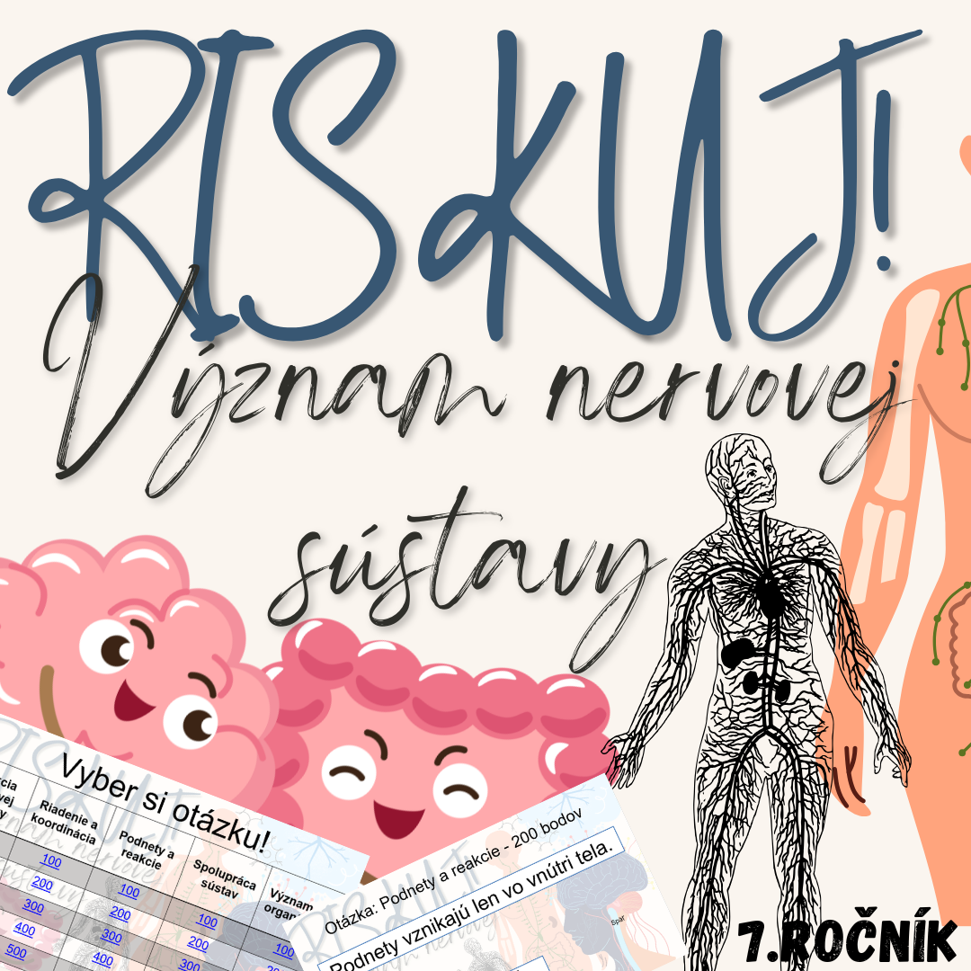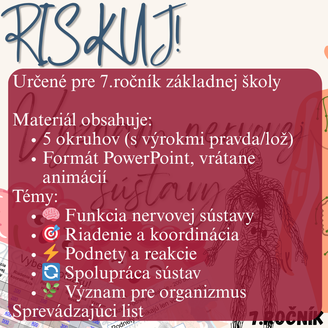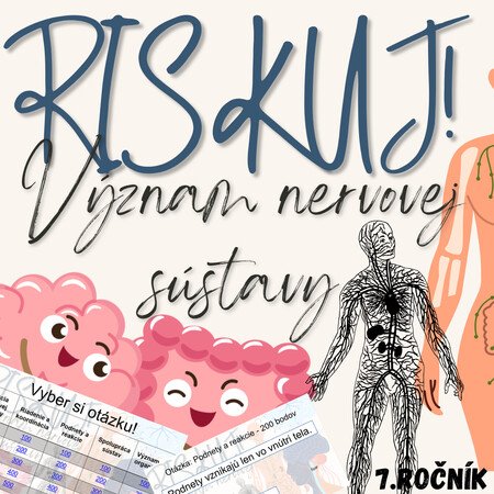 Materiál „RISKUJ! – Význam nervovej sústavy“ je interaktívna a súťažná edukačná hra určená pre žiakov 7. ročníka základnej školy. Zameriava sa na funkciu, riadenie a význam nervovej sústavy pre organizmus.
